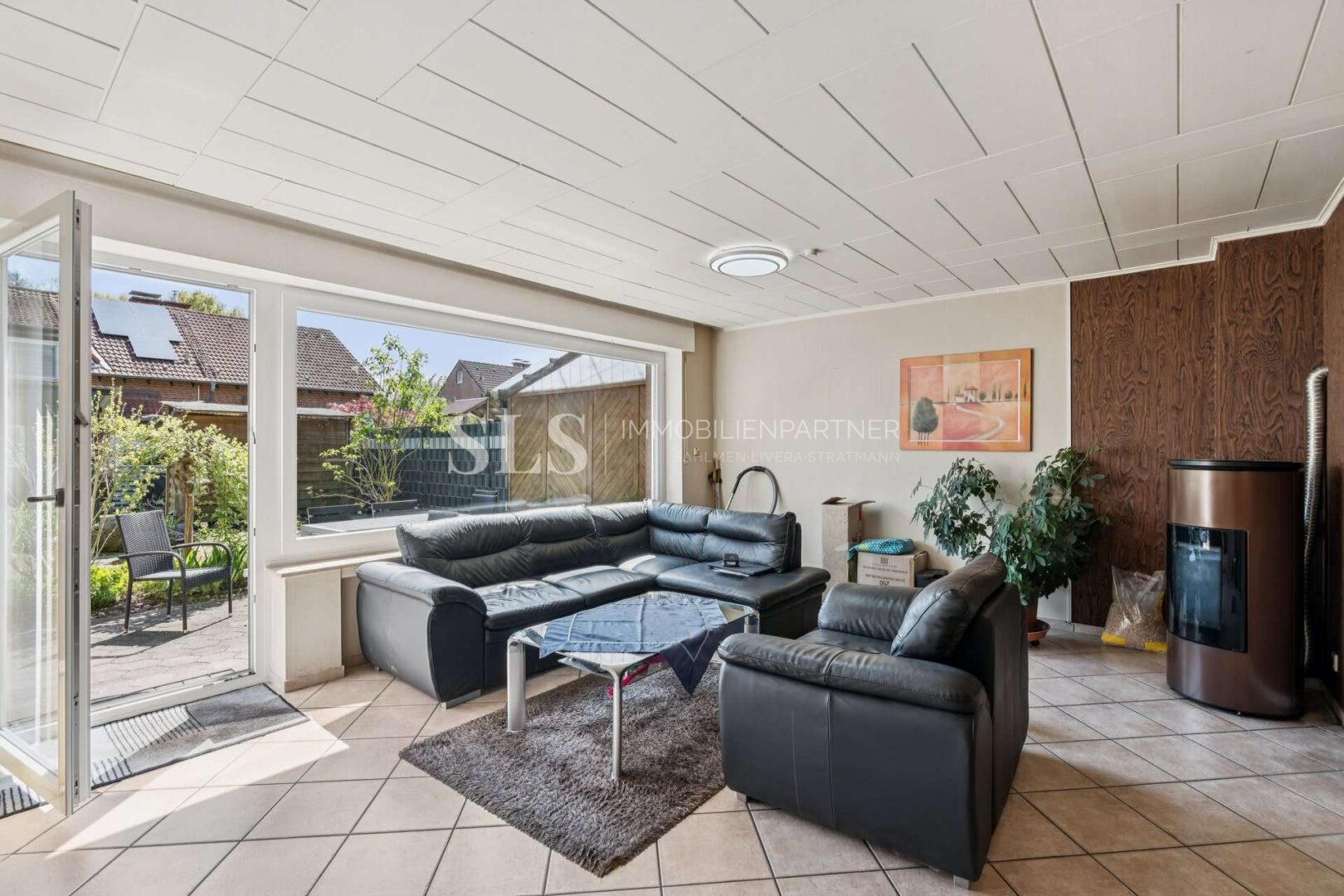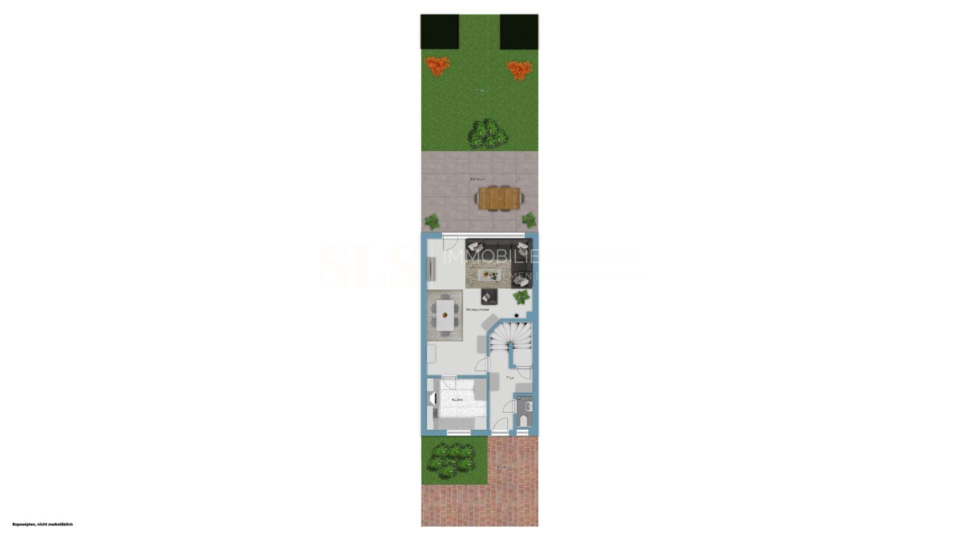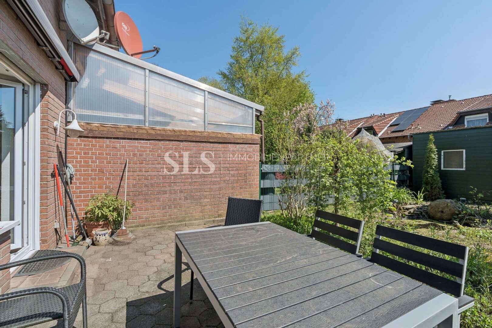 Der Garten präsentiert sich als geschützter Rückzugsort mit gewachsener Bepflanzung und Raum für individuelle Ideen. Ob entspannte Stunden im Freien, gemeinsames Essen auf der Terrasse oder ein kleiner Spielbereich – hier lässt sich der Alltag angenehm ins Grüne erweitern. Die vorhandene Markise ergänzt den Außenbereich sinnvoll und sorgt an sonnigen Tagen für zusätzlichen Komfort.