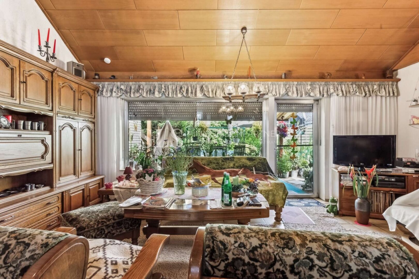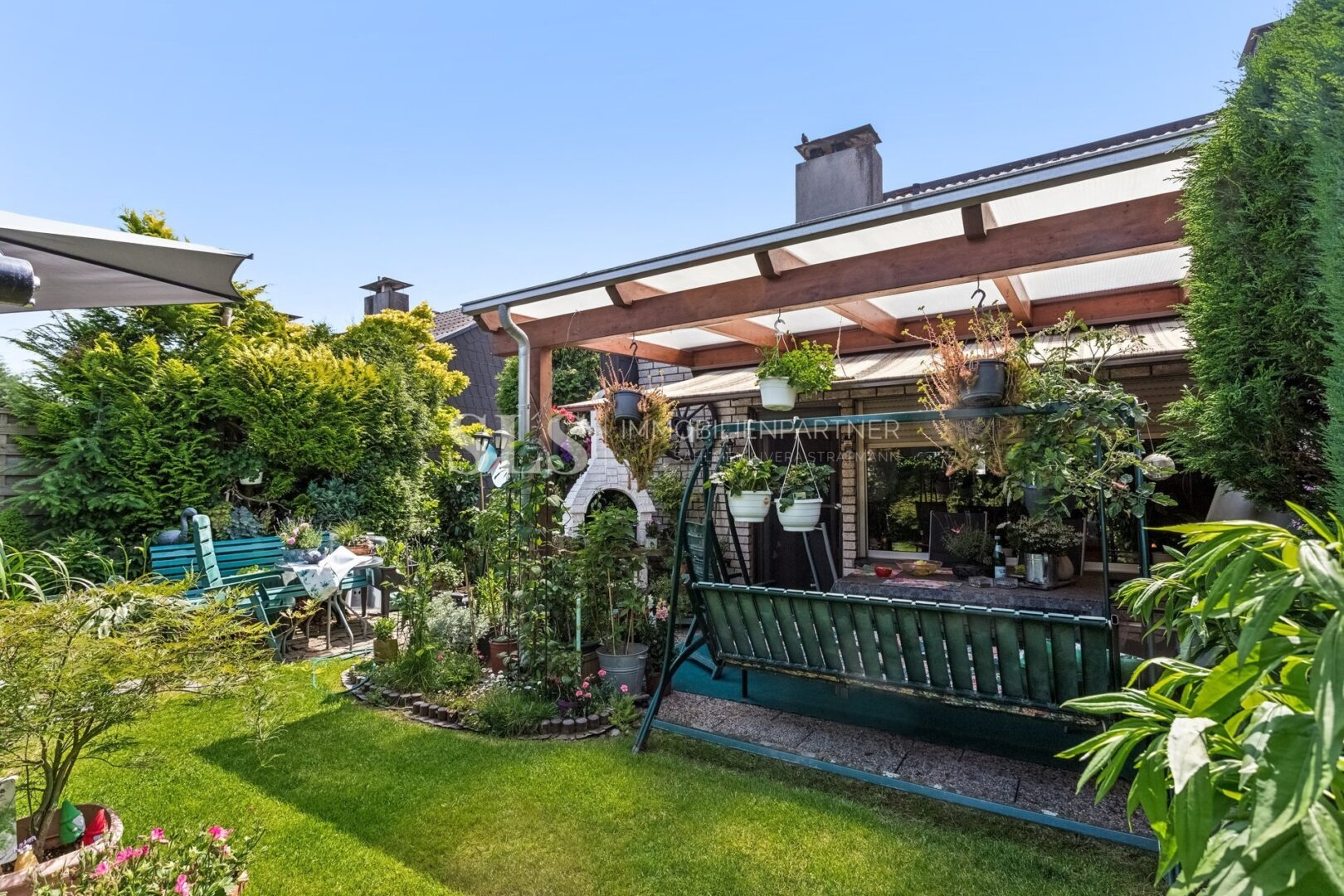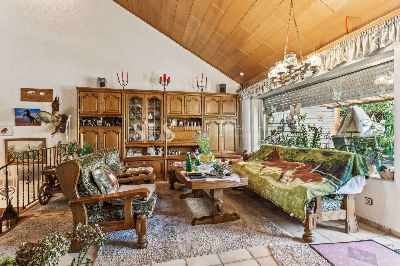 Das Wohnzimmer punktet mit einer beeindruckend hohen Decke und vermittelt ein großzügiges, offenes Raumgefühl. Ein Kamin sorgt hier an kühleren Tagen für wohlige Wärme und schafft eine besonders behagliche Atmosphäre. Direkt angrenzend befinden sich der Essbereich sowie die Küche und der Zugang zur Terrasse – ideal für geselliges Beisammensein. Der Außenbereich ist ein echtes Highlight. Die überdachte Terrasse mit Markise bietet wetterunabhängigen Komfort und lädt zum Verweilen ein. Umgeben von einer liebevoll gepflegten Gartenanlage mit zahlreichen Pflanzen, dekorativen Elementen und einem gemauerten Grill, genießen Sie hier pure Erholung im Grünen.