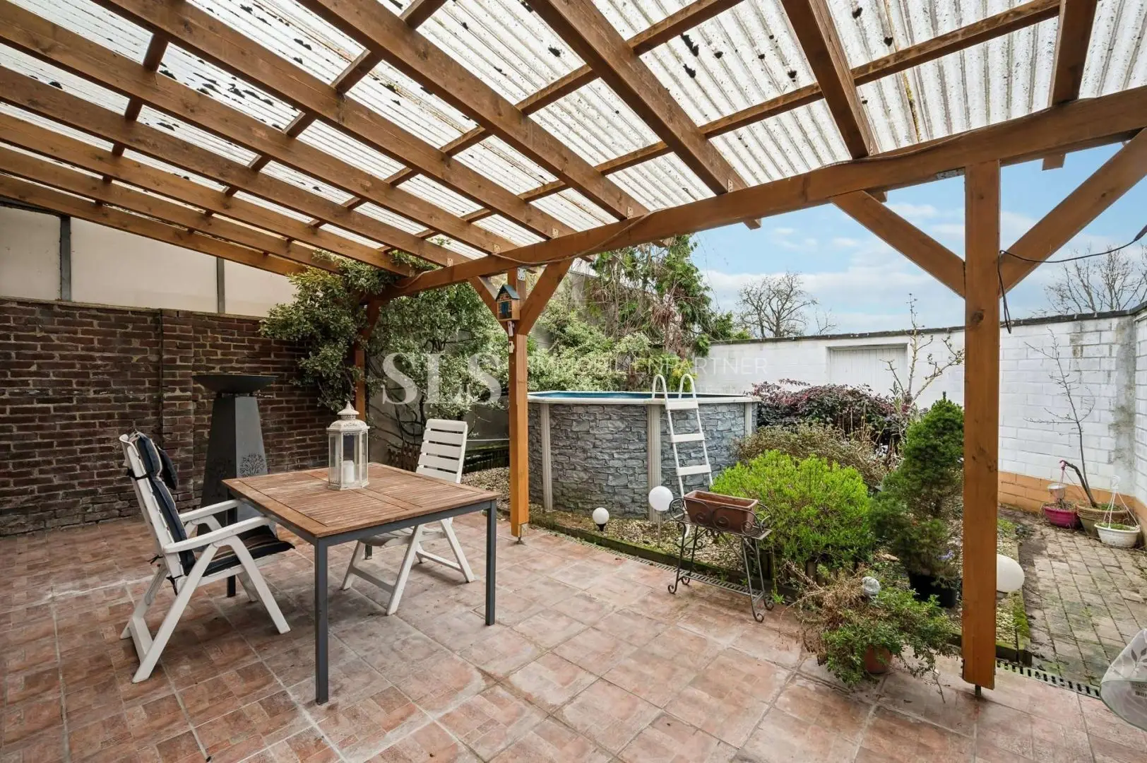 Ein besonderes Highlight ist die große, überdachte Terrasse, die nahtlos in den Garten übergeht. Hier genießen Sie Privatsphäre und einen schönen Blick auf den Poolbereich und die liebevoll angelegte Grünfläche mit Teich und Bepflanzung.