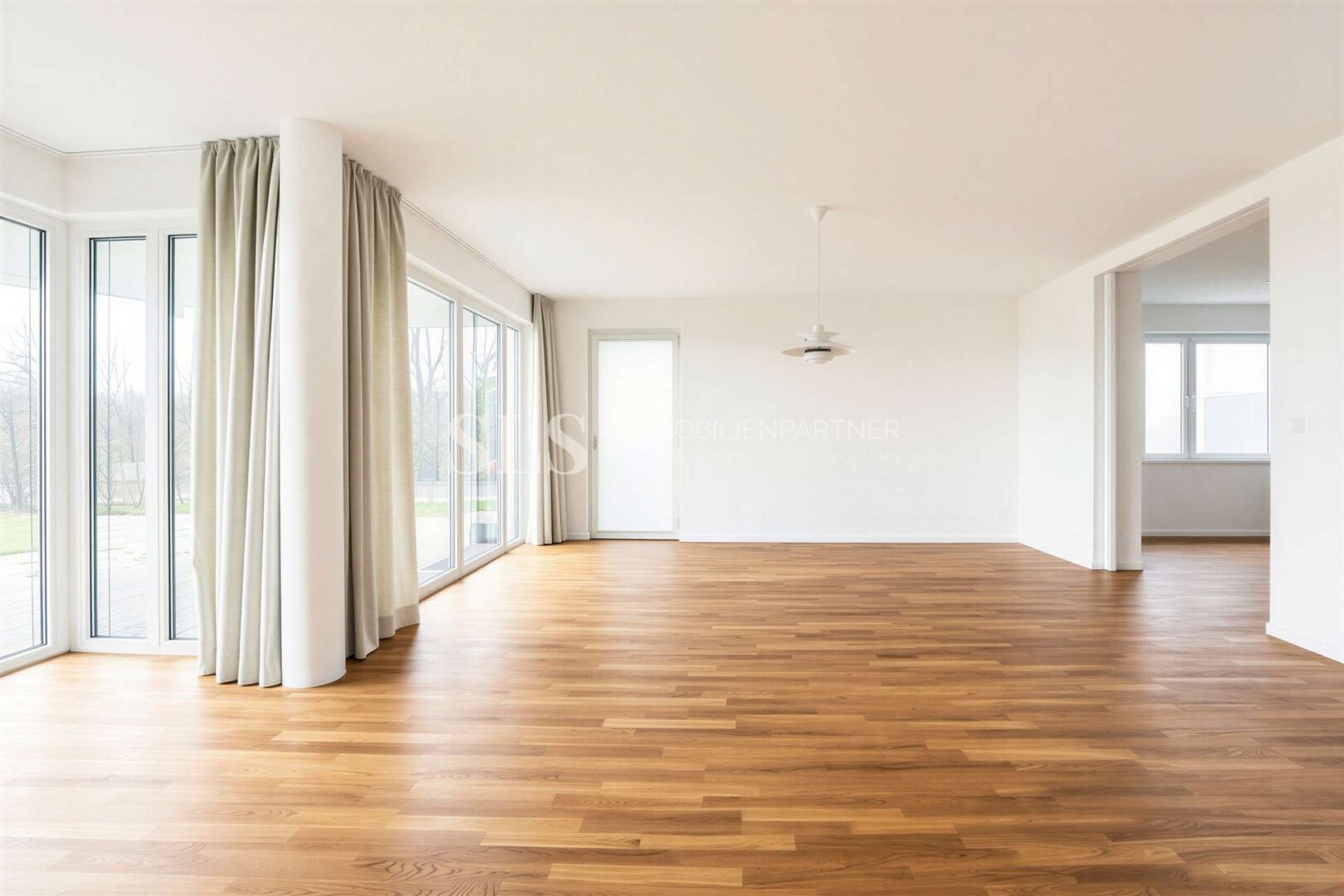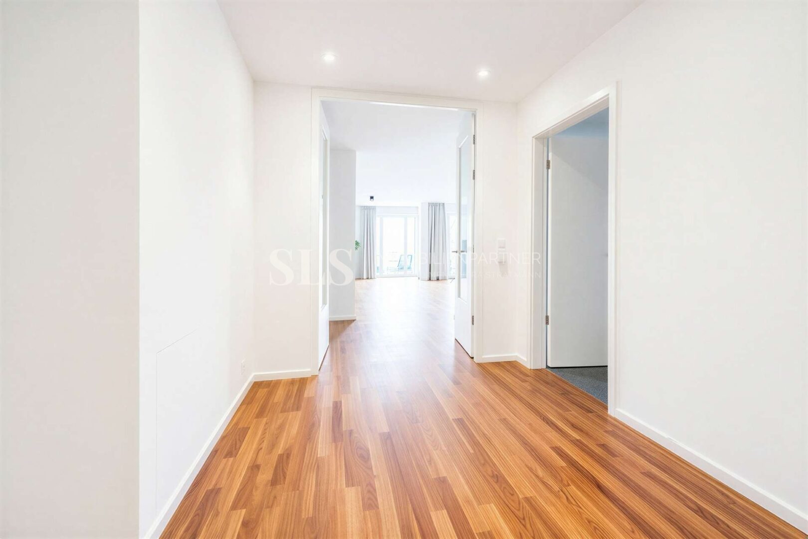 Bereits beim Betreten wird deutlich, dass hier nicht nur Wohnraum, sondern ein Lebensraum geschaffen wurde. Der offen gestaltete Wohn- und Essbereich bildet das Herzstück der Wohnung und überzeugt durch seine Weite sowie die harmonische Verbindung zur angrenzenden Terrasse. Großzügige Fensterflächen lassen viel Licht herein und schaffen eine angenehme, ruhige Atmosphäre, die sich durch die gesamte Wohnung zieht. Die Raumaufteilung ist durchdacht und flexibel zugleich. Neben dem großzügigen Wohnbereich stehen zwei weitere Zimmer zur Verfügung, die sich ideal als Schlaf-, Gäste- oder Arbeitszimmer nutzen lassen. Ergänzend besteht die Möglichkeit, mit überschaubarem Aufwand einen zusätzlichen Raum zu schaffen und die Wohnung so individuell an die eigenen Bedürfnisse anzupassen. Das Schlafzimmer überzeugt mit einem direkt angeschlossenen Bad en suite, ausgestattet mit Wanne und Dusche sowie einem integrierten Ankleidebereich. Ein weiteres Duschbad steht Gästen oder Familienmitgliedern zur Verfügung und rundet den Wohnkomfort auf hohem Niveau ab. Die Ausstattung folgt einem klaren, zeitlosen Stil. Echtholzparkett, weiß verputzte Wände und hochwertige Design-Elemente in den Bädern schaffen eine ruhige und elegante Grundstimmung. Die Fußbodenheizung sorgt für ein angenehmes Raumklima, während elektrisch regulierbare Sonnenblenden zusätzlichen Komfort bieten.