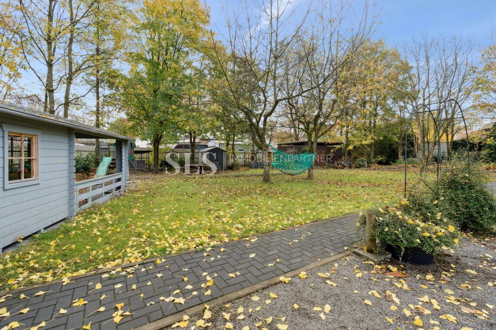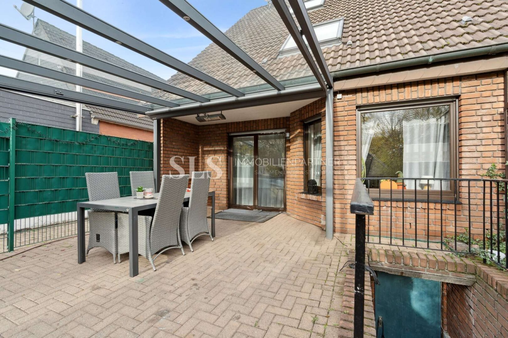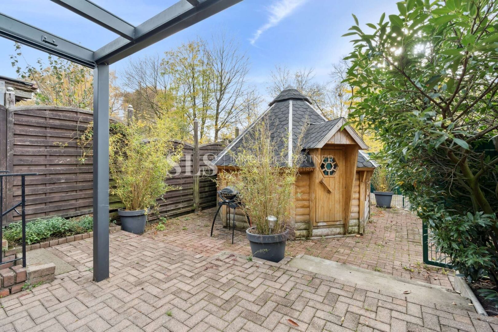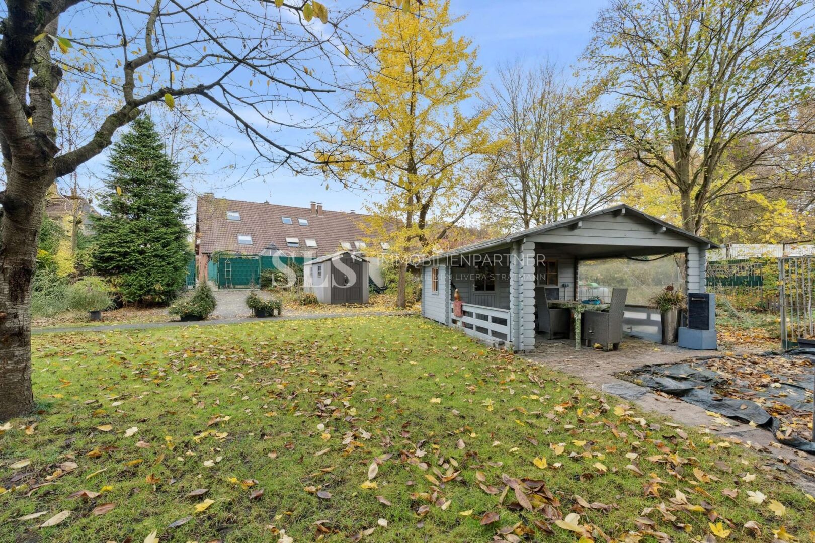 überdachten Terrasse und dem Garten mit einer geräumigen Gartenhütte. Hier lässt sich das Wohnen bei jedem Wetter genießen. Der gemütliche Kamin sorgt in der kalten Jahreszeit für eine behagliche Atmosphäre.