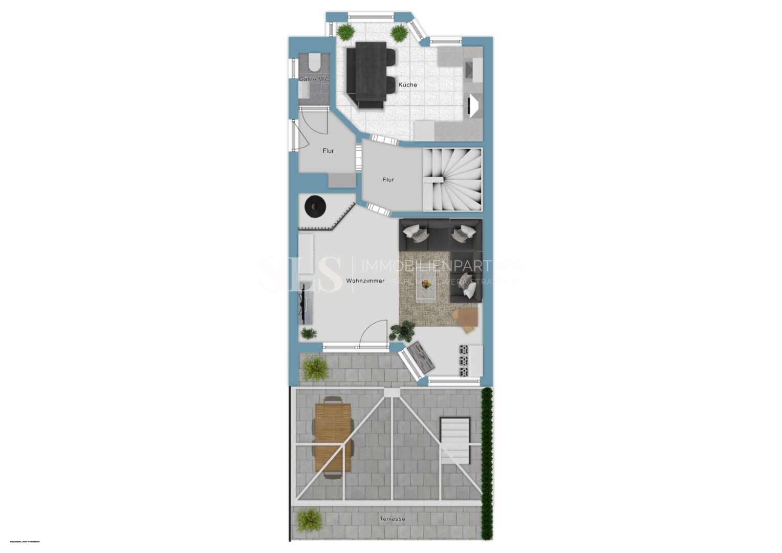 Im Erdgeschoss befindet sich der großzügige Wohn- und Essbereich mit Zugang zur großen,