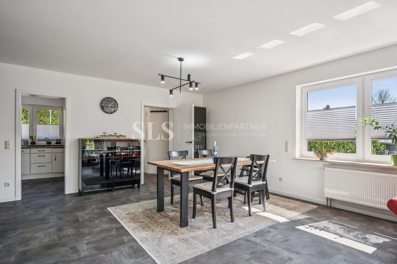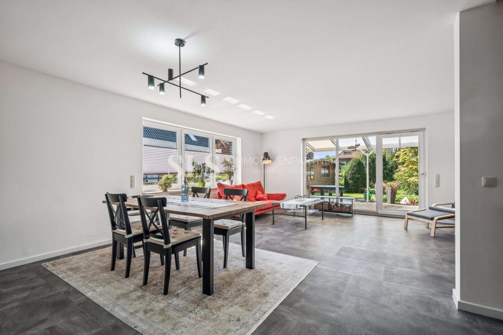 Das Herzstück des Hauses ist der großzügige Wohn- und Essbereich. Hier entsteht genau die Atmosphäre, die in guten Exposés oft versprochen, aber selten wirklich gehalten wird: offen, hell, freundlich und mit einer angenehmen Großzügigkeit, die sofort einlädt. Große Fensterflächen sorgen für viel Tageslicht und schaffen einen harmonischen Übergang in den Außenbereich. Der Blick in den Garten, das Grün und die geschützte Terrassensituation verleihen dem gesamten Wohnbereich eine ruhige, fast entspannte Selbstverständlichkeit. Man spürt direkt: Hier spielt sich das Leben ab – gemeinsame Essen, ruhige Abende, Kindergeburtstage, Gespräche mit Freunden oder einfach der ganz normale, schöne Alltag.