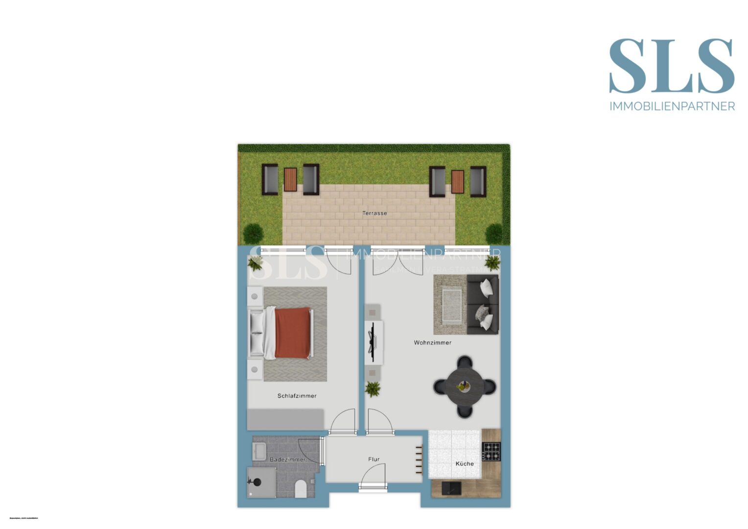 Der Mittelpunkt der Wohnung ist der freundliche Wohn- und Essbereich mit direktem Zugang zur Terrasse. Große Fensterflächen sorgen für viel Tageslicht und schaffen eine offene, einladende Atmosphäre. Von hier aus öffnet sich der Blick ins Grüne, während die kleine eigene Gartenecke zusätzlichen Freiraum bietet – ein schöner Platz für ruhige Stunden im Freien.