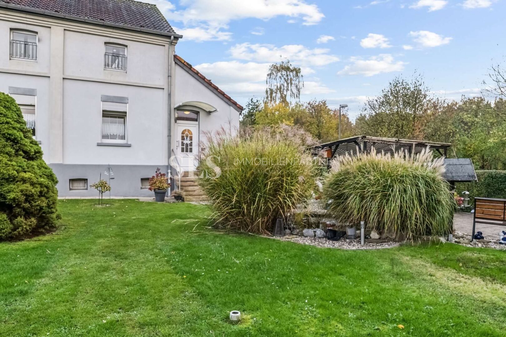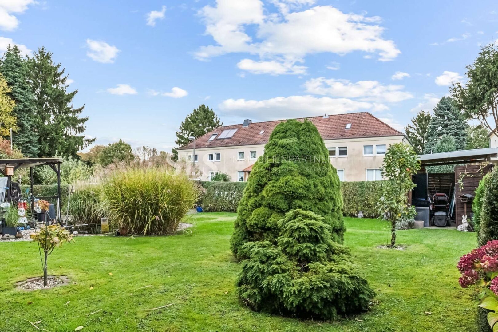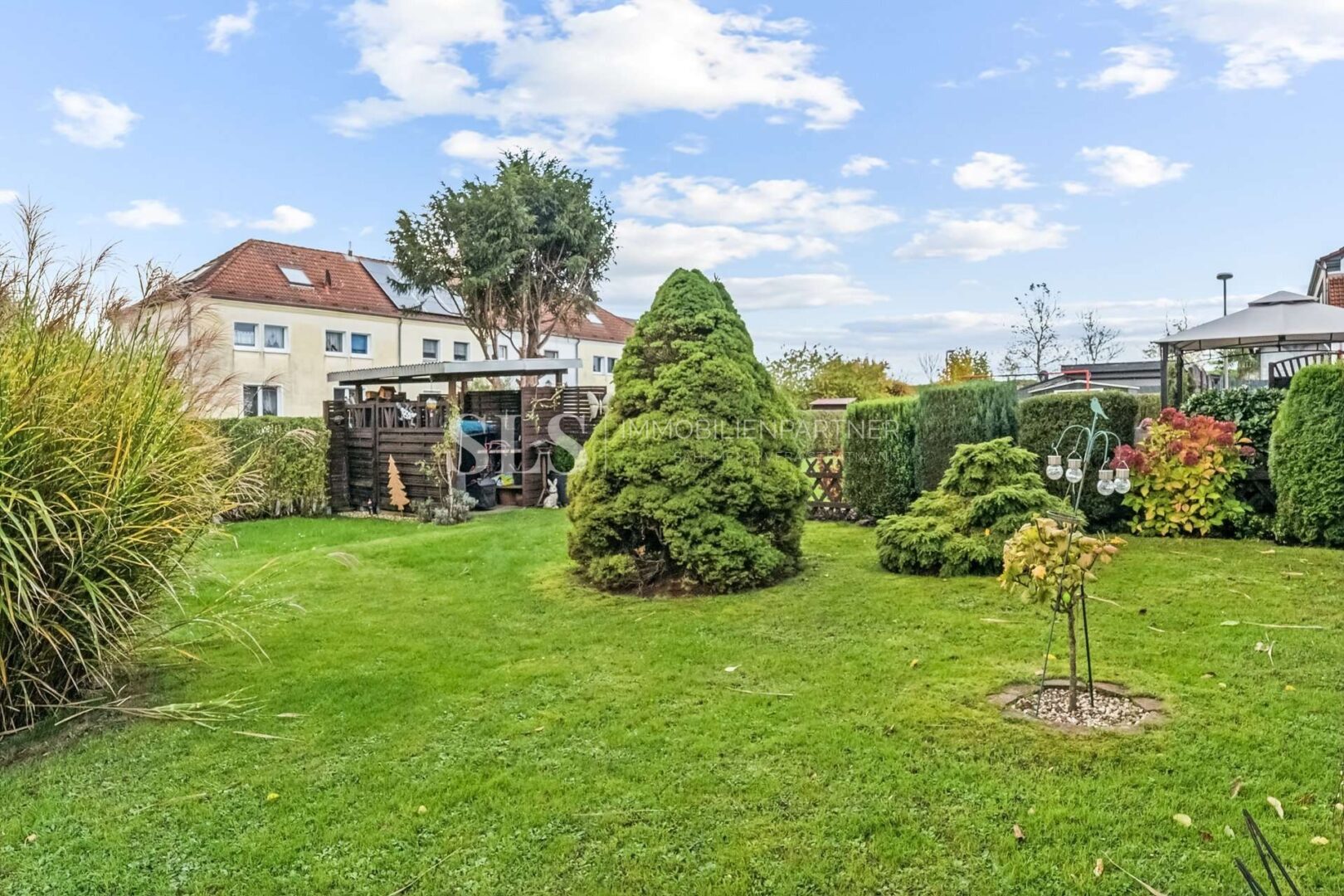 Der Garten ist liebevoll angelegt, mit einer großzügigen Terrasse und viel Grünfläche. Hier zeigt sich, dass die Mieter das Haus mit großem Verantwortungsgefühl pflegen und den Garten in bestem Zustand halten.