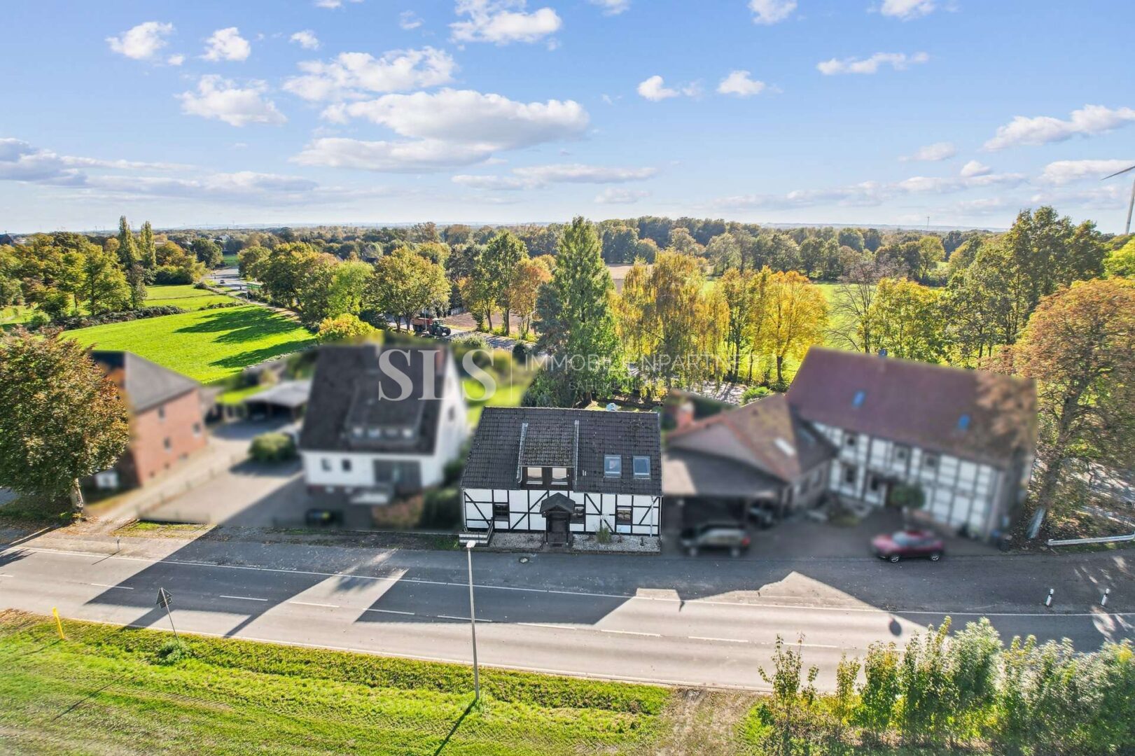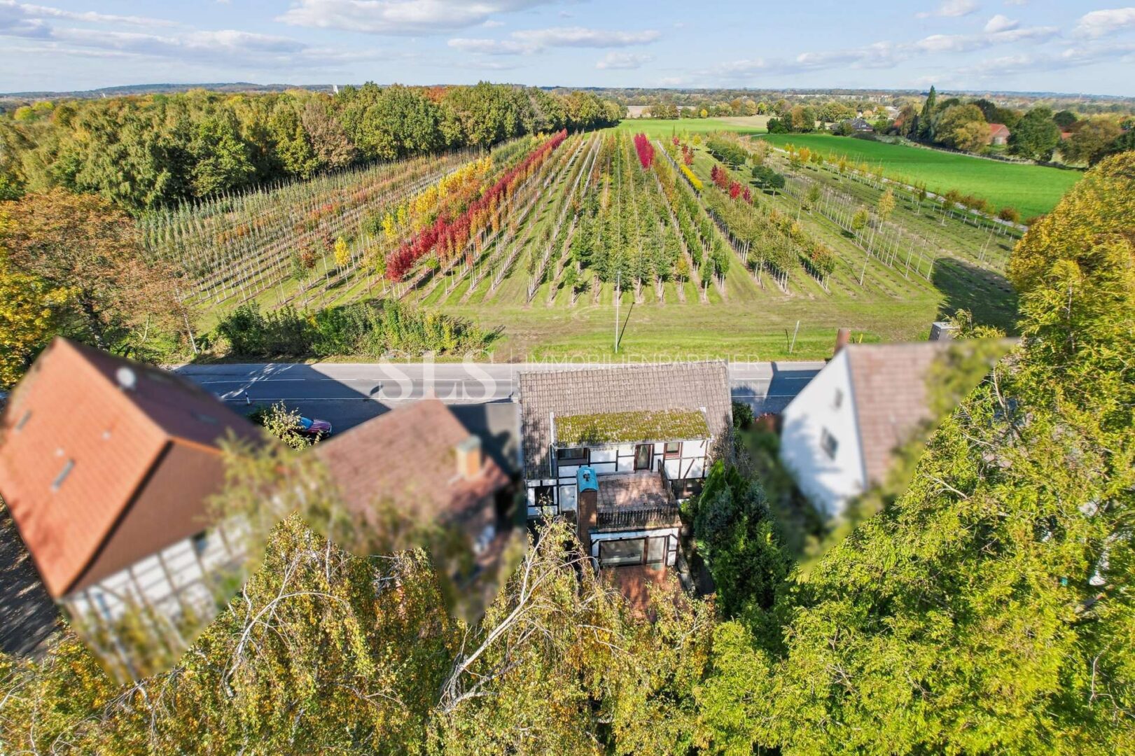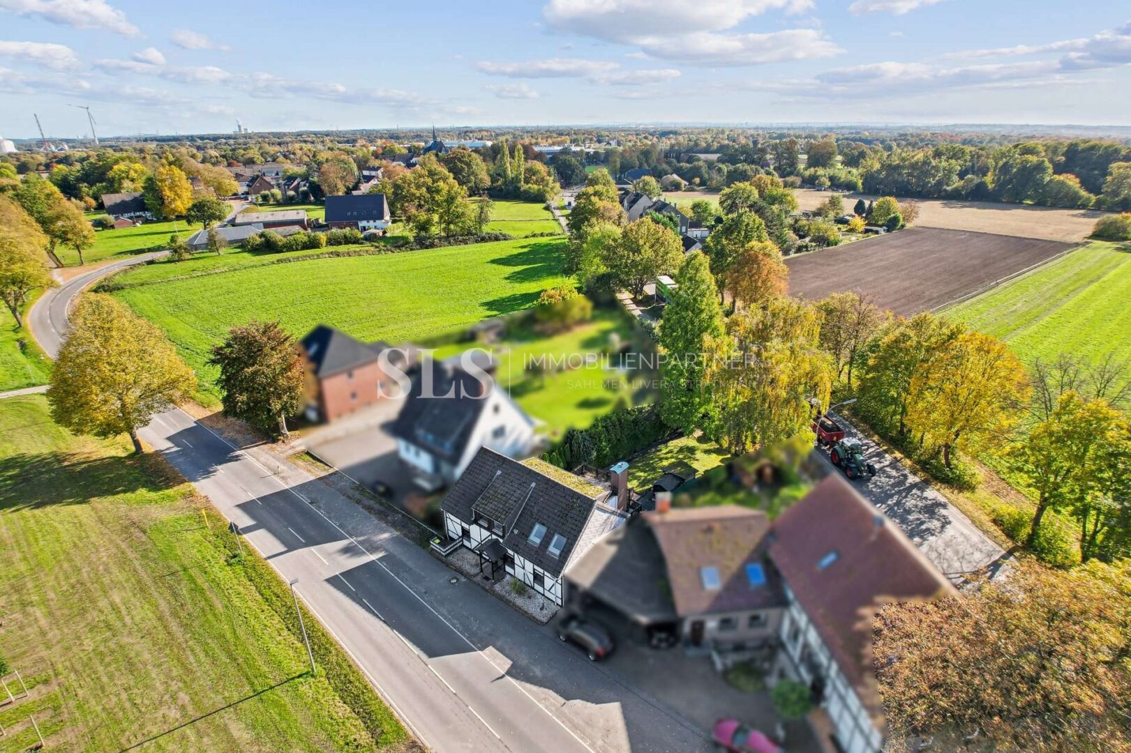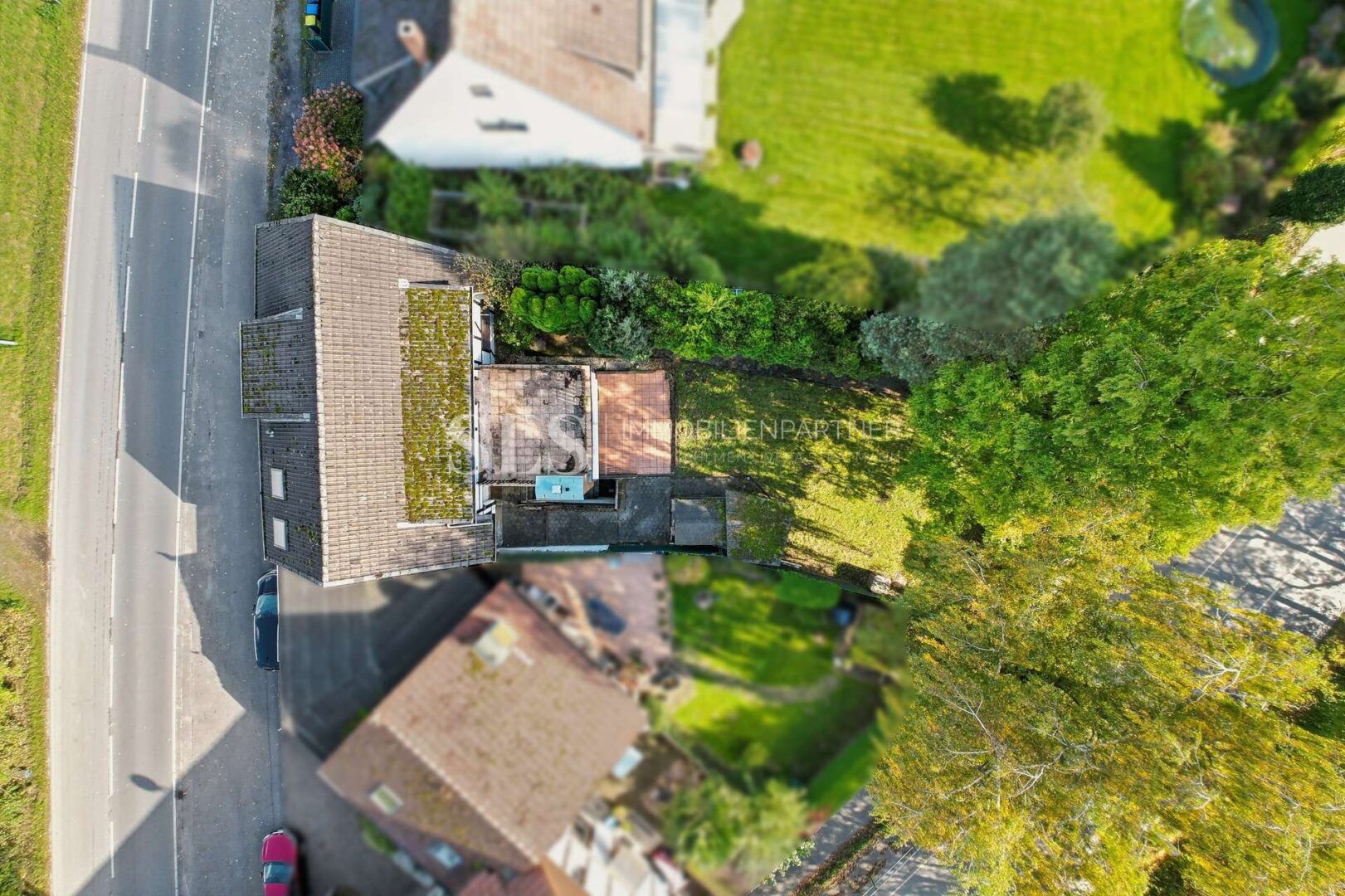 Das Grundstück liegt im Außenbereich, umgeben von Wiesen und nur wenigen Nachbarn. Eine Straße führt am Haus vorbei, eine weitere hinter dem Garten entlang. Vor dem Haus kann geparkt werden, hinter dem Haus öffnet sich der Garten – ruhig, grün, mit gewachsenem Baumbestand.