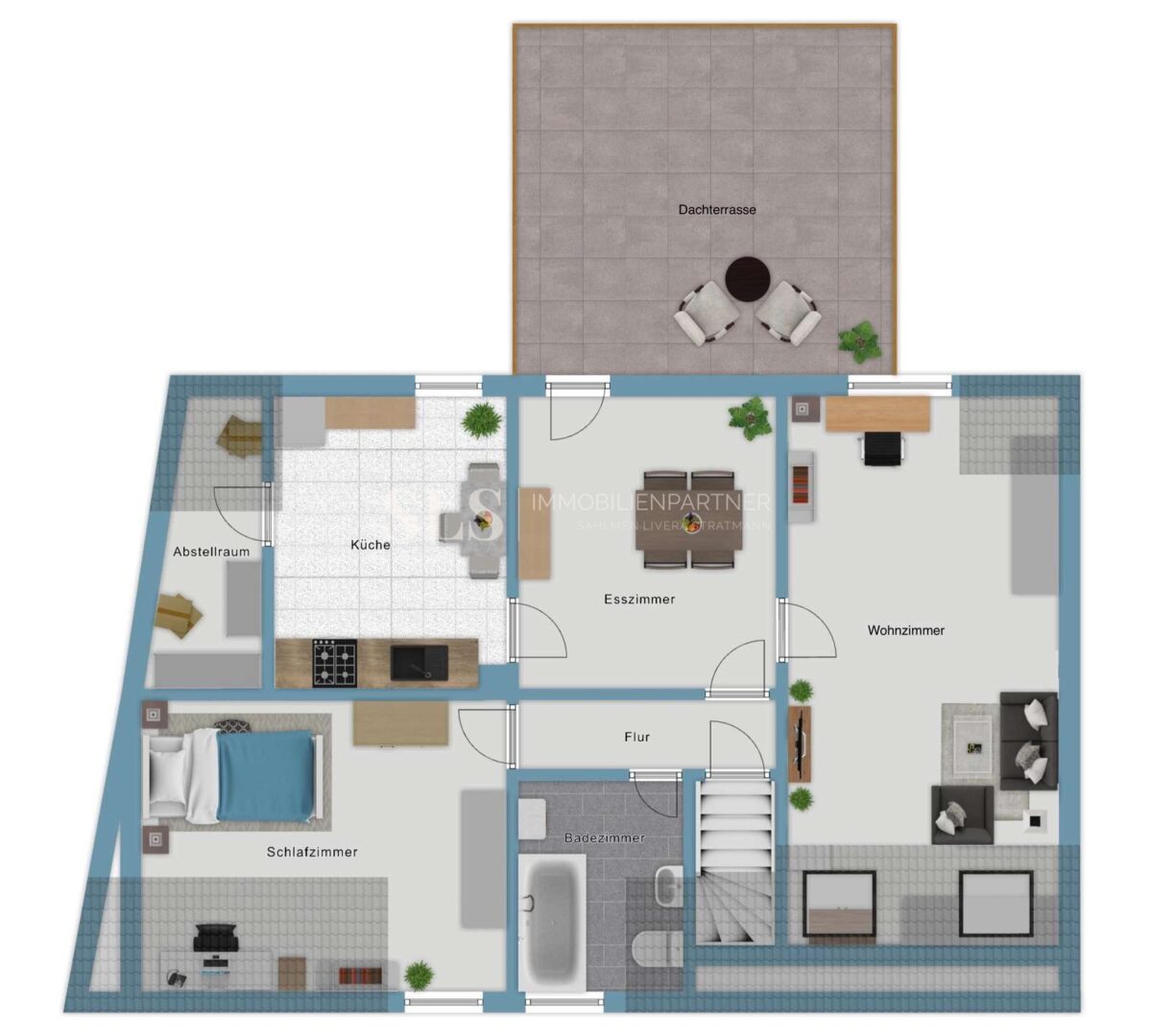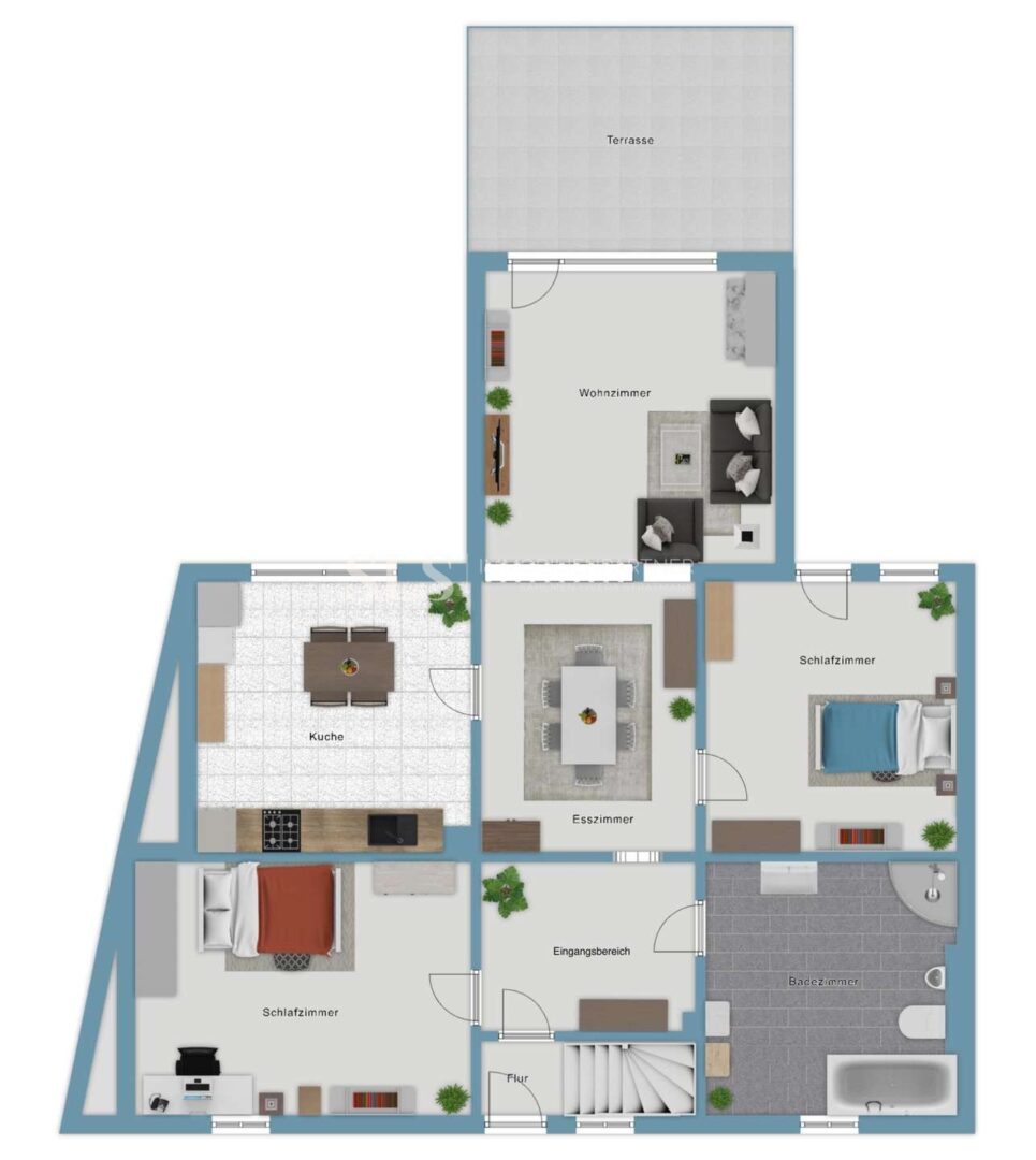 Mit rund 175 Quadratmetern Wohnfläche bietet das Haus viel Raum für Leben. Die Aufteilung über zwei Etagen erlaubt verschiedene Wohnformen: klassisch als Einfamilienhaus, als Zuhause für zwei Generationen oder mit einer abgetrennten Einheit für erwachsene Kinder oder Gäste. Jede Etage hat eigene Wohnräume, ein Bad, eine Küche und Zugang ins Freie – unten in den Garten, oben auf die Dachterrasse mit weitem Blick ins Grüne.