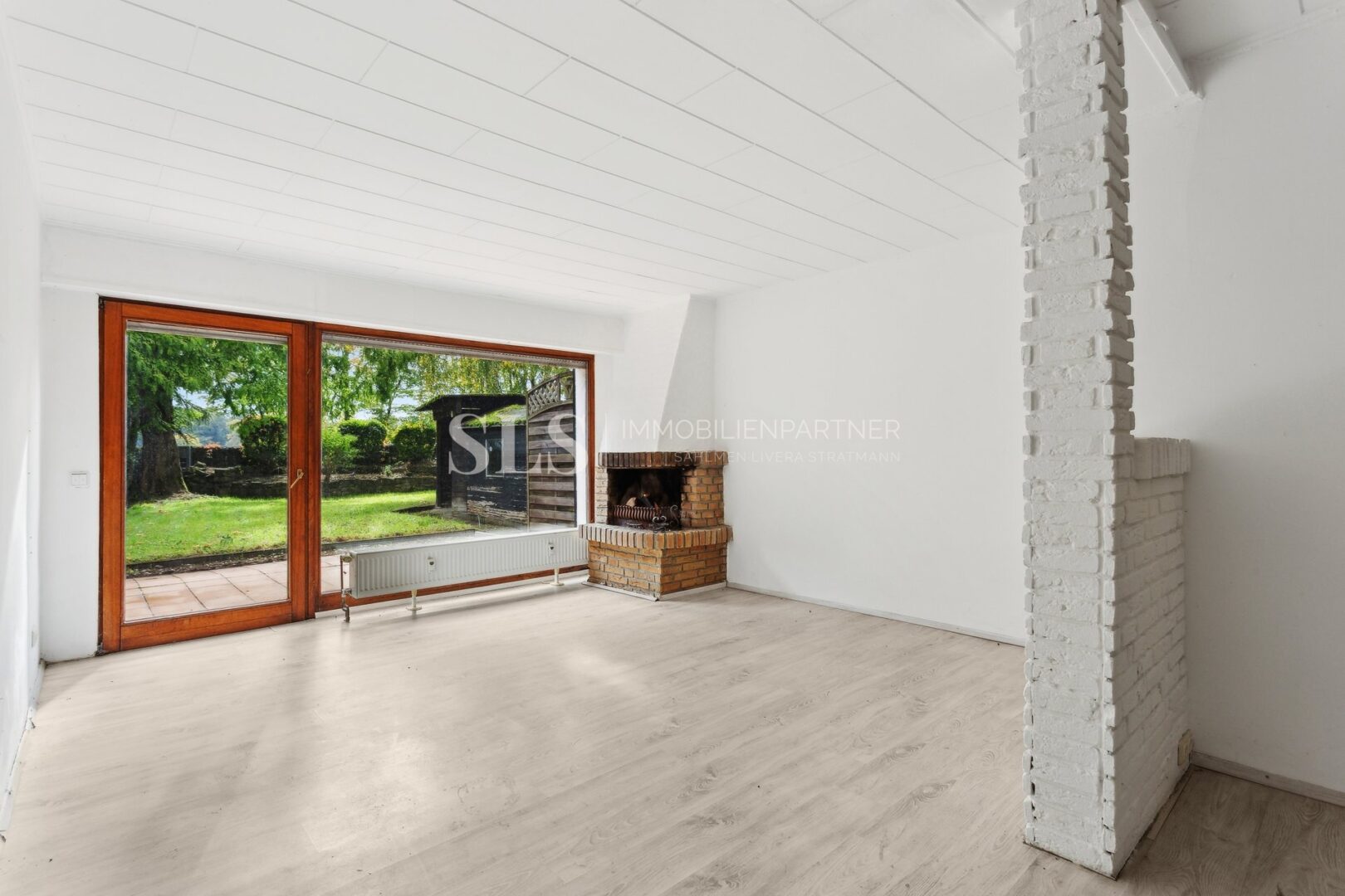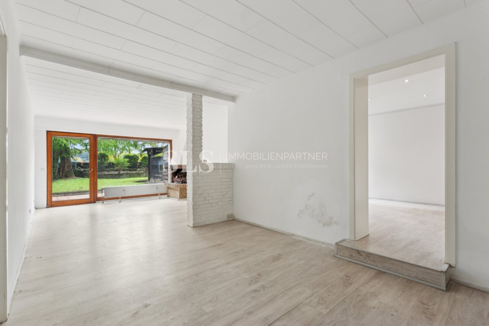 Drinnen spürt man sofort diese besondere Mischung aus Beständigkeit und Wärme. Der Wohnbereich mit Kamin, die sichtbaren Balken, das Licht, das durch die Fenster fällt und den Blick in den Garten öffnet – alles wirkt echt und gewachsen. Der alte Baumbestand und die ruhige Lage am Rand der Felder verleihen dem Haus eine Atmosphäre, die man nicht planen kann.