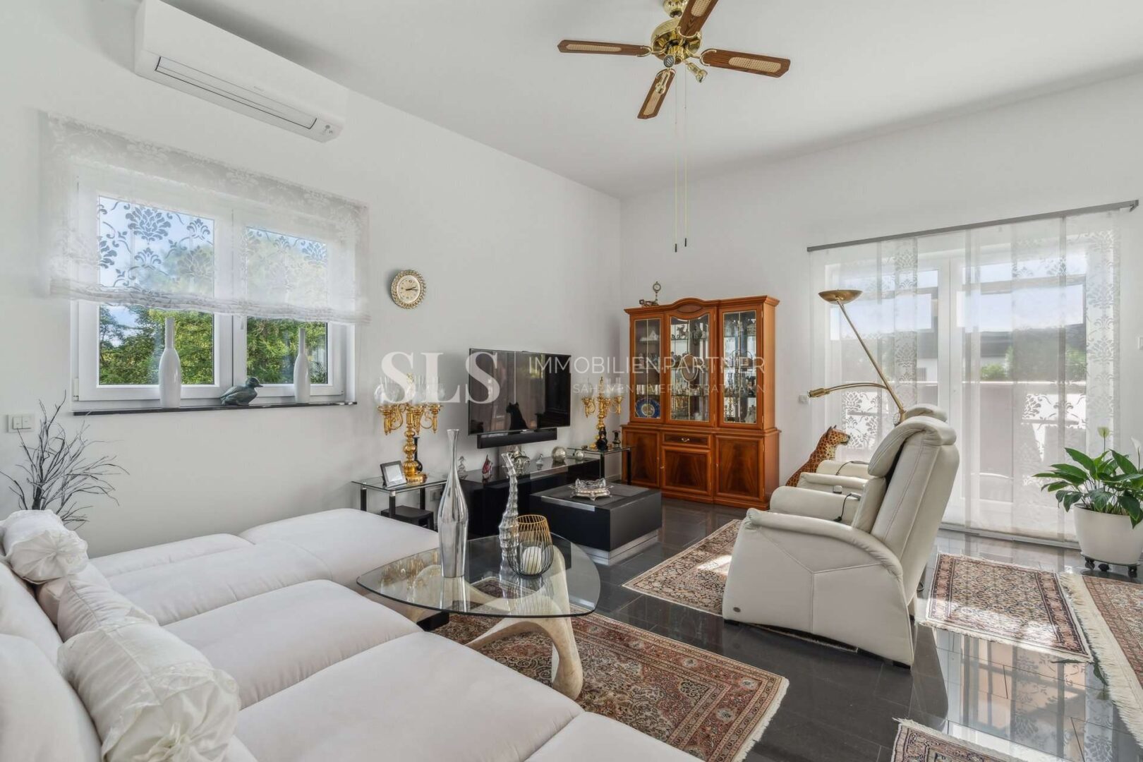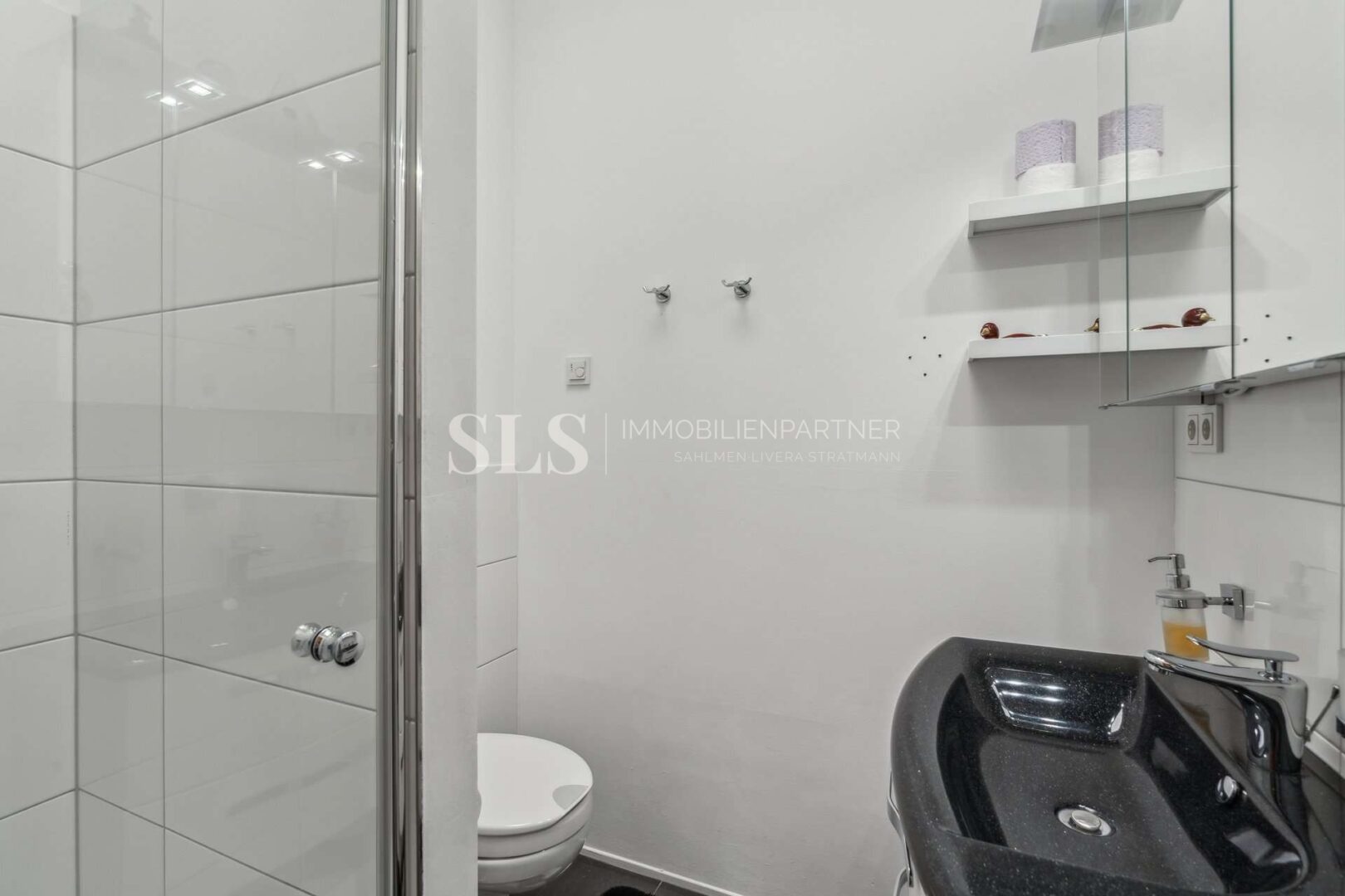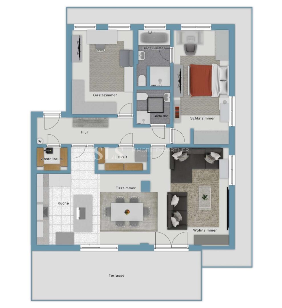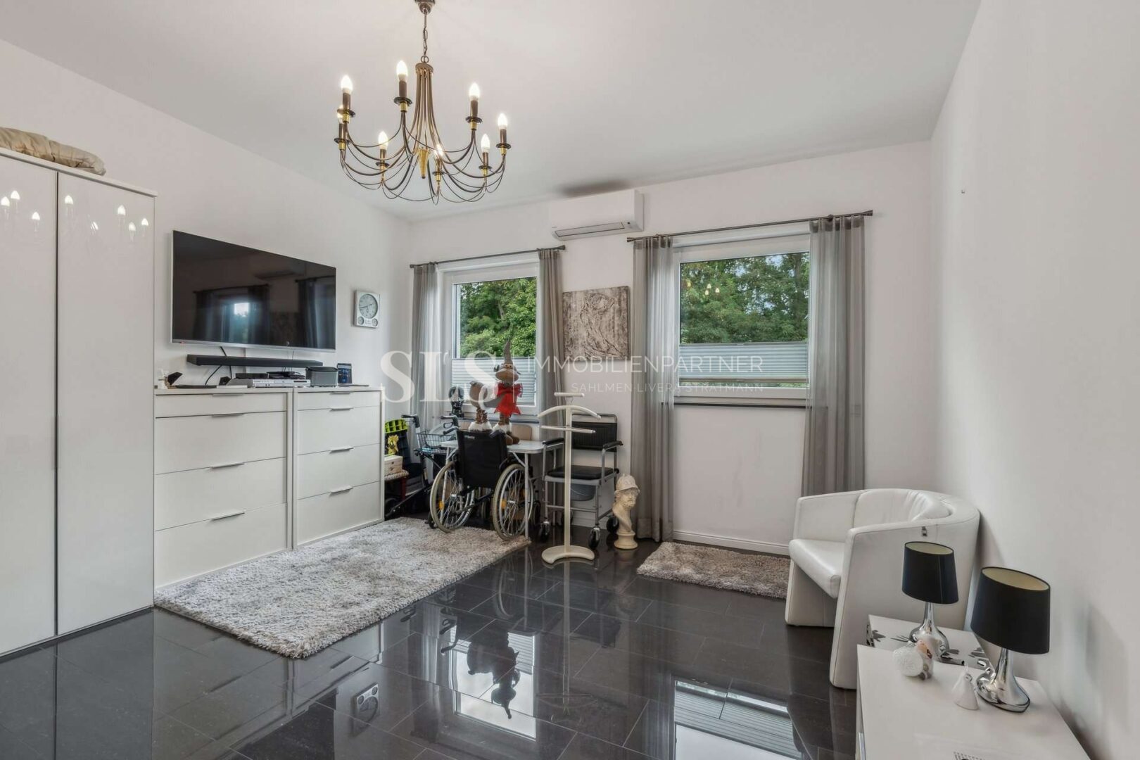 Zwei Schlafzimmer bilden den privaten Bereich. Ergänzt wird dieser durch zwei hochwertig ausgestattete Badezimmer: ein Elternbadezimmer mit Badewanne, Dusche und Fenster sowie ein Gästebadezimmer mit Dusche und Lichtkuppel. Zwei Abstellräume innerhalb der Wohnung vervollständigen den Grundriss, einer davon mit Anschlüssen für Waschmaschine und Trockner. Die im Kaufpreis enthaltene Einbauküche sowie Klimaanlagen im Wohnzimmer und in beiden Schlafzimmern fügen sich nahtlos in das hochwertige Gesamtkonzept ein und bieten spürbaren Wohnkomfort.