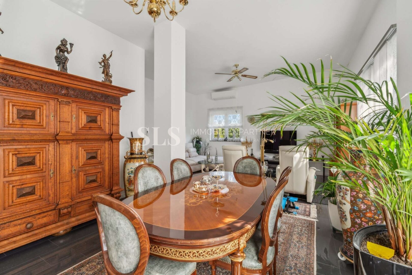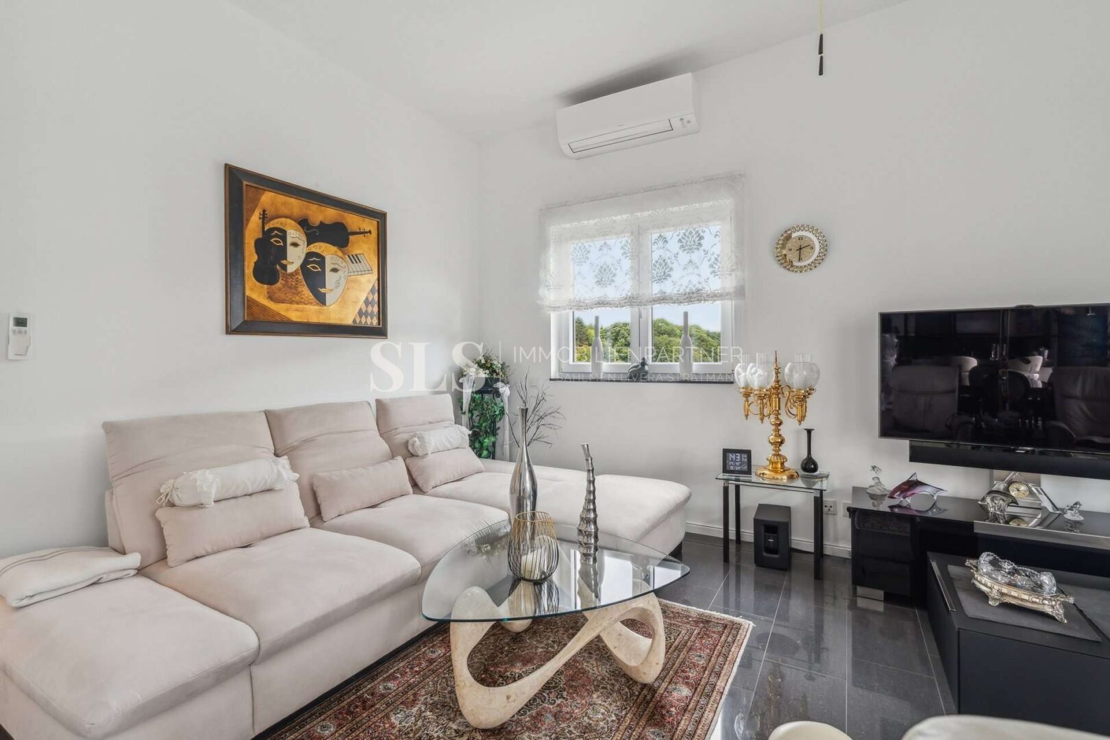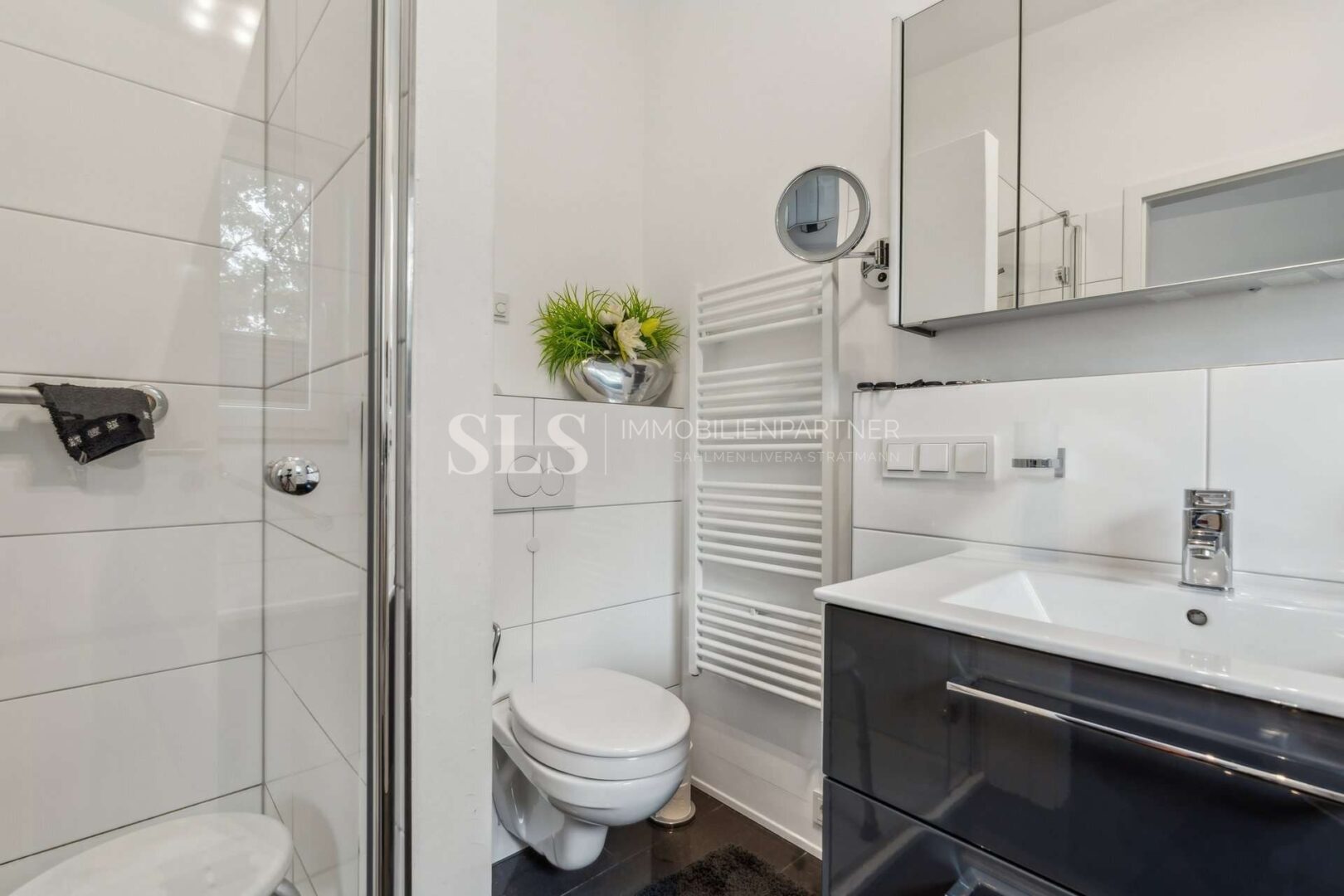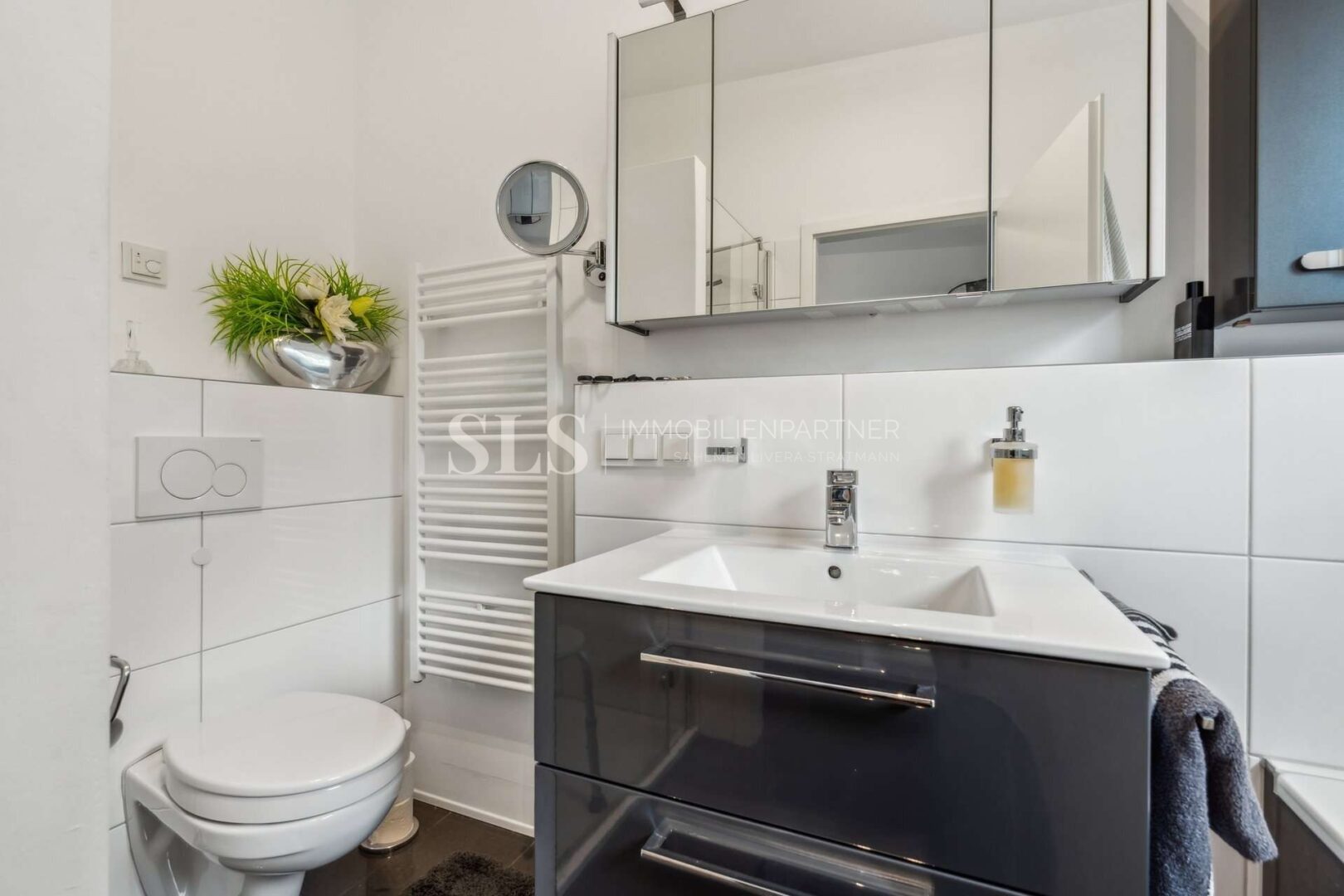 Zwei Schlafzimmer bilden den privaten Bereich. Ergänzt wird dieser durch zwei hochwertig ausgestattete Badezimmer: ein Elternbadezimmer mit Badewanne, Dusche und Fenster sowie ein Gästebadezimmer mit Dusche und Lichtkuppel. Zwei Abstellräume innerhalb der Wohnung vervollständigen den Grundriss, einer davon mit Anschlüssen für Waschmaschine und Trockner. Die im Kaufpreis enthaltene Einbauküche sowie Klimaanlagen im Wohnzimmer und in beiden Schlafzimmern fügen sich nahtlos in das hochwertige Gesamtkonzept ein und bieten spürbaren Wohnkomfort.