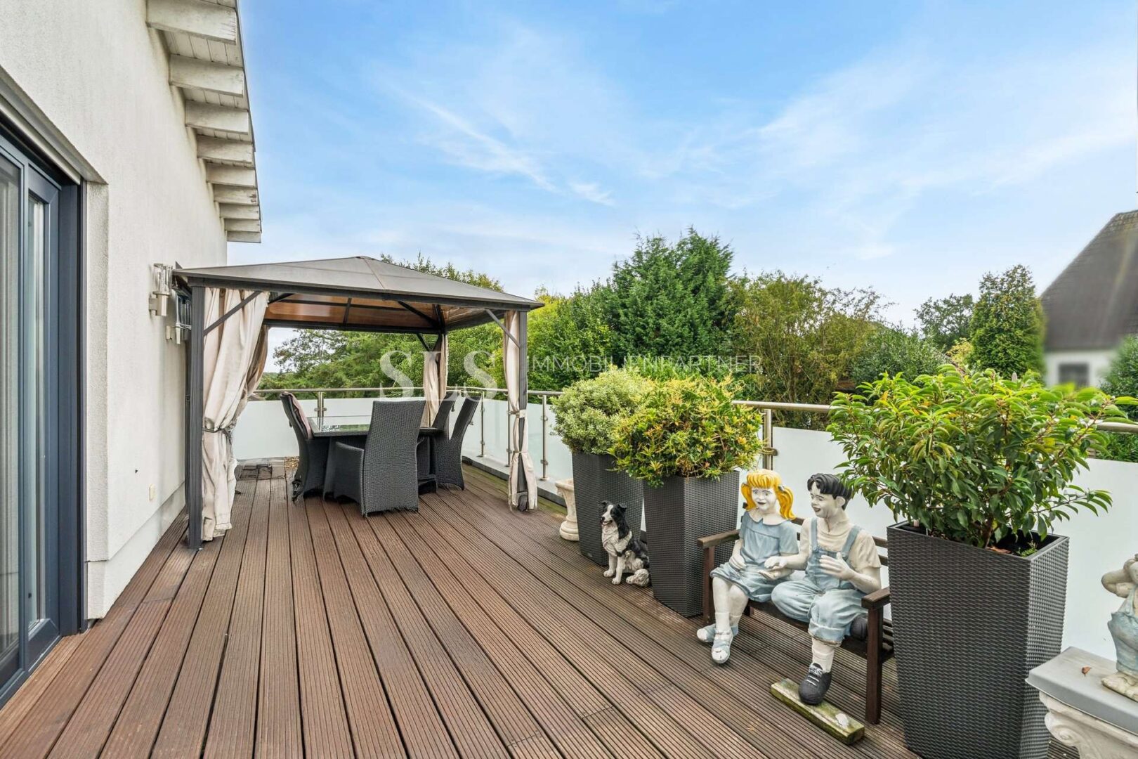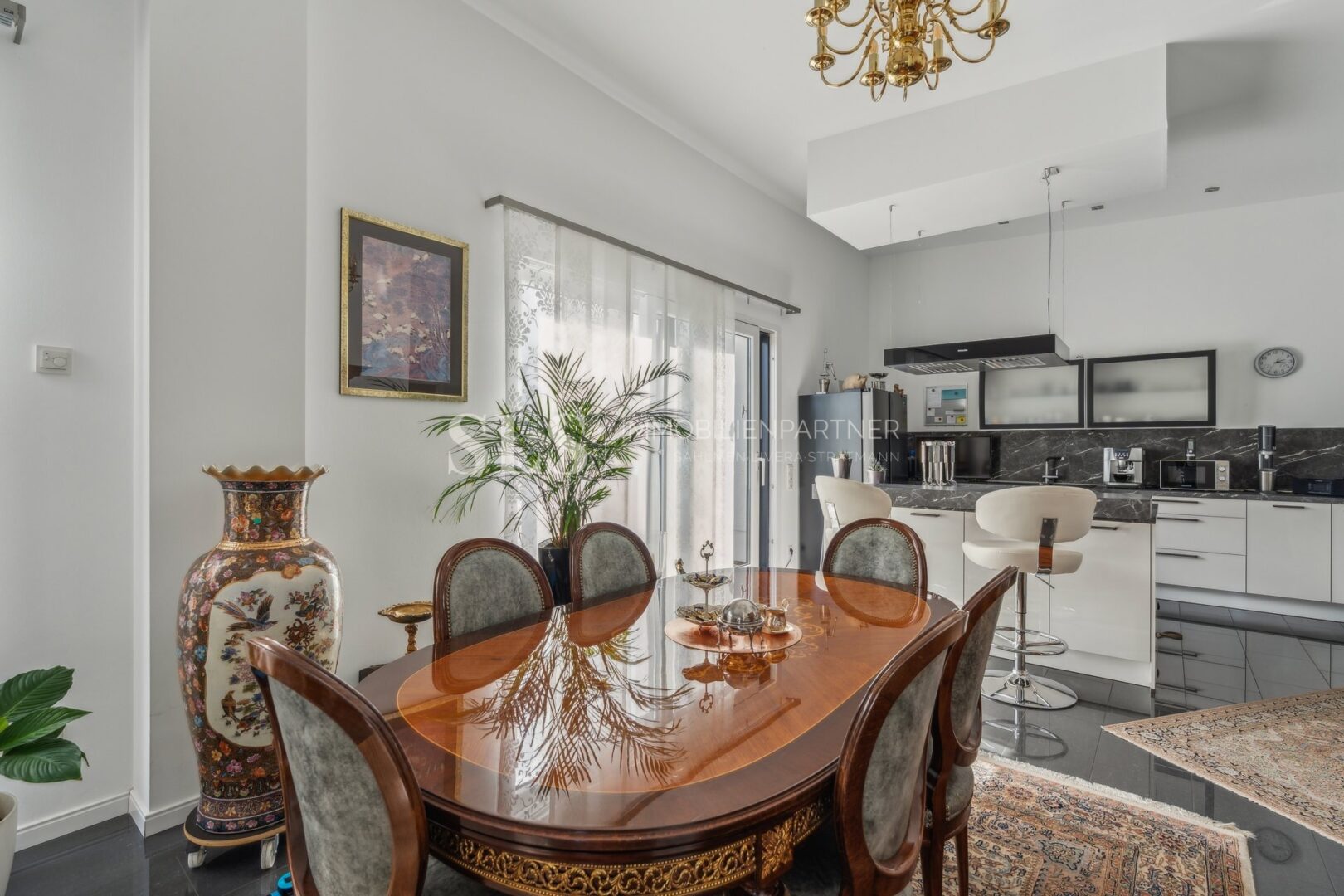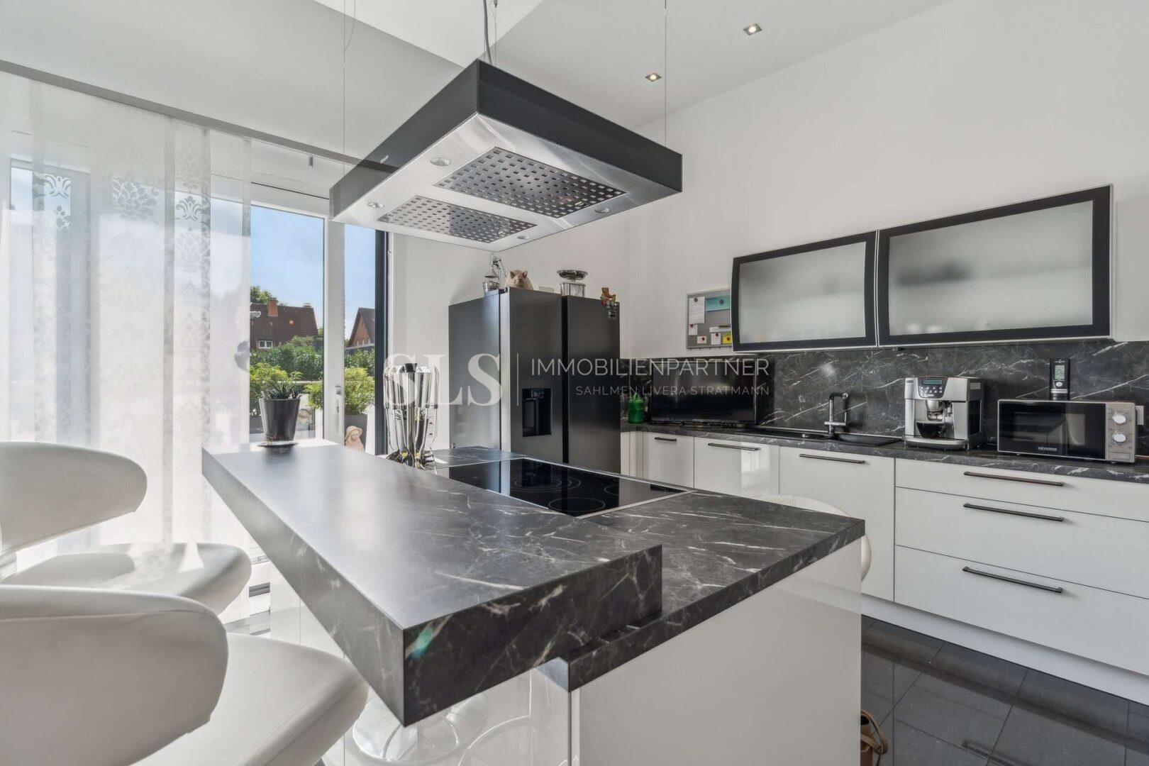 Auf rund 137 m² Wohnfläche entfaltet sich ein großzügiges Raumkonzept mit klarer Struktur. Der Wohn- und Essbereich mit offener Küche umfasst knapp 53 m² und wird durch bodentiefe Fensterflächen hell belichtet. Von hier aus führt der direkte Zugang auf die etwa 31 m² große Dachterrasse, die zur ruhigen Rückseite ausgerichtet ist und einen ungestörten Blick ins Grüne eröffnet. Dieser Außenbereich unterstreicht den besonderen Charakter des Penthouses. Zusätzlich besteht im Wohnbereich ein zentraler Kaminanschluss, der die Errichtung eines repräsentativen, freistehenden Kamins ermöglicht.