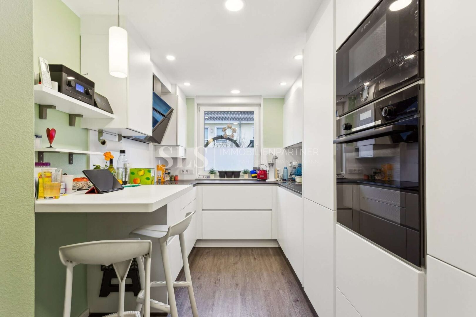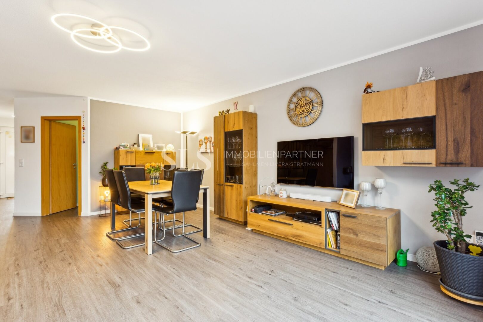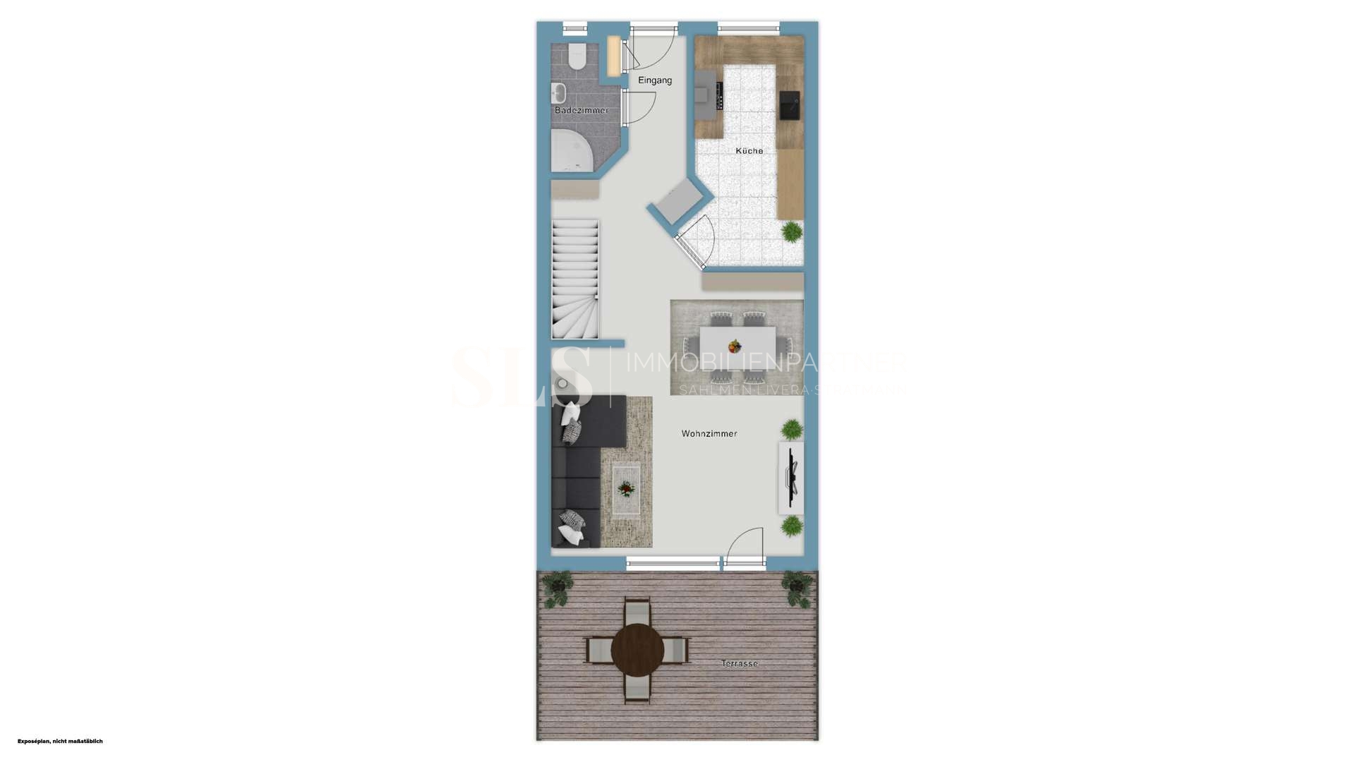 Im Erdgeschoss bildet die großzügig und offen gestaltete Wohn- und Esszimmerkombination den zentralen Lebensmittelpunkt des Hauses. Große Fensterflächen sorgen für viel Tageslicht und schaffen eine angenehme, einladende Atmosphäre. Von hier aus gelangen Sie direkt in den liebevoll angelegten Garten, der sowohl Raum zur Erholung als auch Platz für Spiel- und Freizeitmöglichkeiten bietet. Die in den Grundriss integrierte Küche unterstreicht den kommunikativen Charakter des Wohnbereichs und ermöglicht kurze Wege im Alltag.