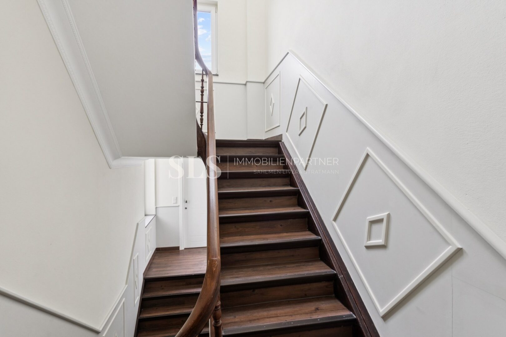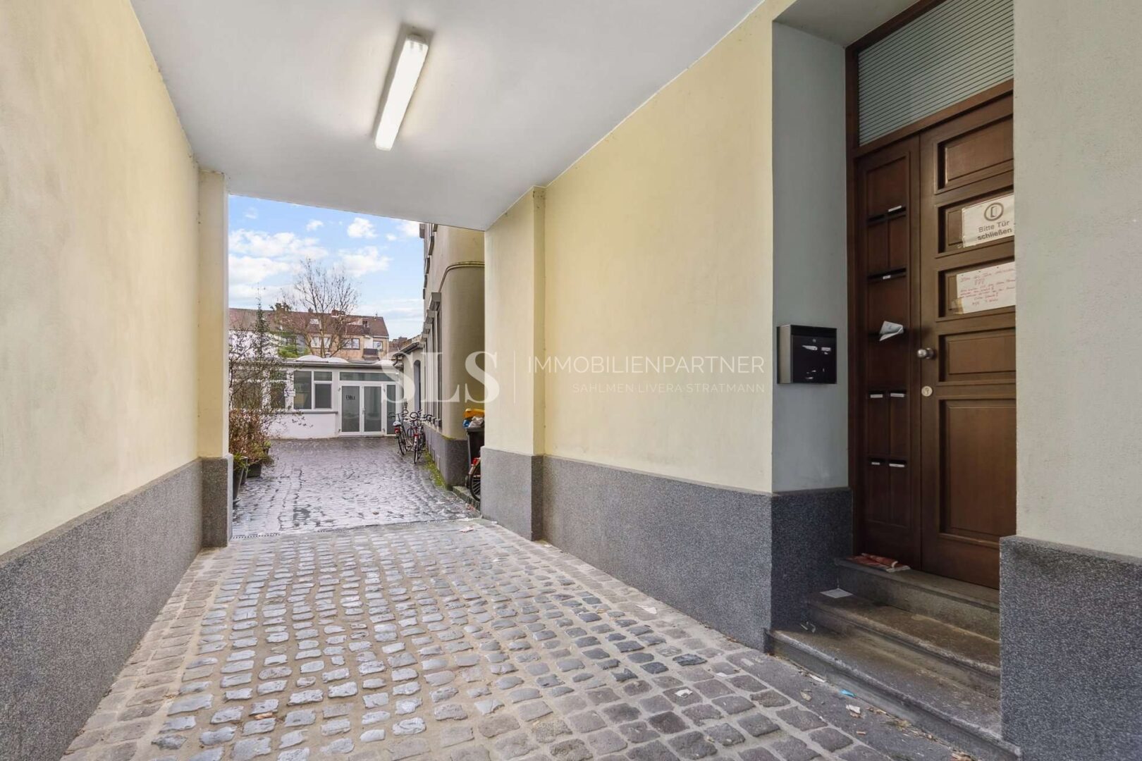 Die Fassade präsentiert sich klassisch und stilvoll mit architektonischen Details, die dem Gebäude eine repräsentative Ausstrahlung verleihen. Der gepflegte Innenhof schafft eine angenehme Erschließungssituation und bietet praktische Abstellmöglichkeiten für Fahrräder. Bereits beim Betreten wird deutlich, dass das Objekt kontinuierlich instand gehalten wurde.