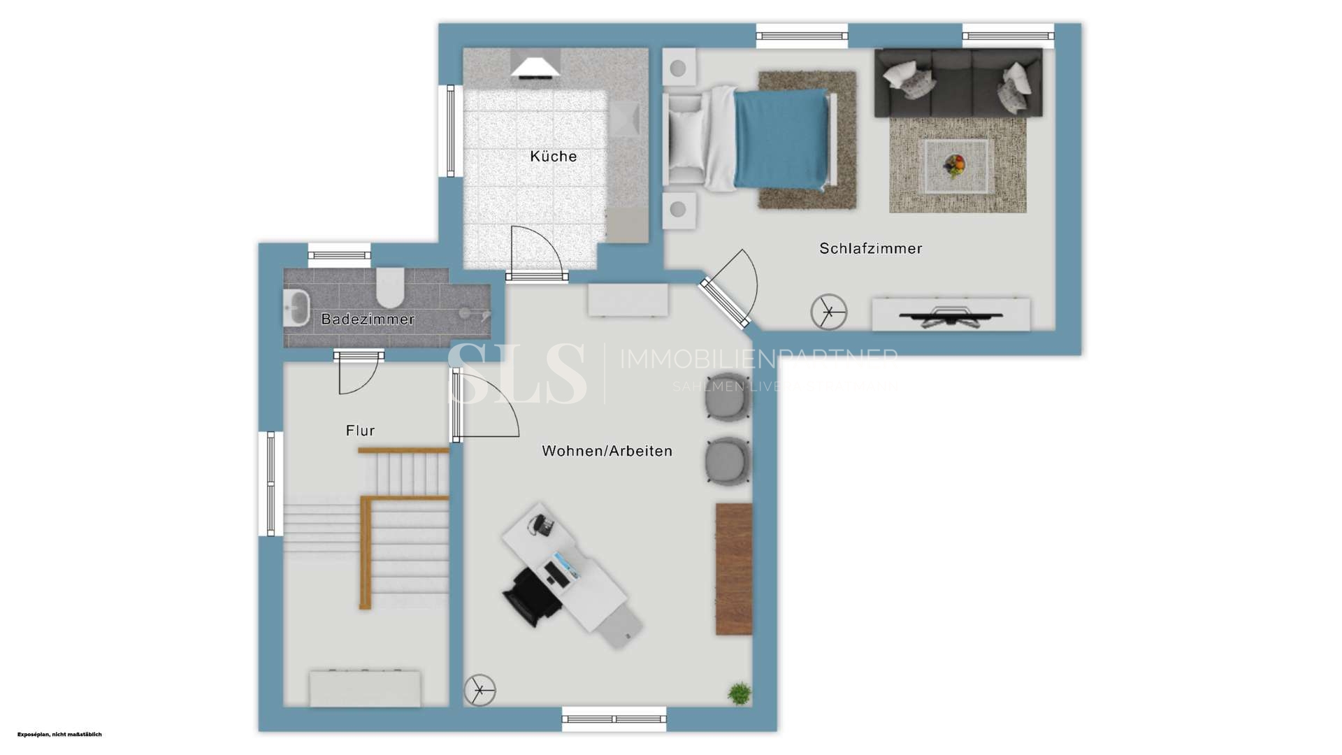 Im Erdgeschoss befindet sich der Wohnbereich des Hauses. Der Raum ist derzeit durch eine Leichtbauwand in ein Wohnzimmer und ein angrenzendes Schlafzimmer unterteilt. Diese Trennung lässt sich bei Bedarf ohne großen Aufwand wieder öffnen, sodass ein großzügiger, zusammenhängender Wohn- und Essbereich entstehen kann. Die Küche grenzt direkt an diesen Bereich an und bietet Zugang zur Terrasse und zum Garten. Im Wohnzimmer besteht außerdem die Möglichkeit, einen Kaminofen anzuschließen. Die vorhandenen Einbauküchen verbleiben im Haus und sind bereits im Kaufpreis enthalten. Ein kleiner Abstellraum am seitlichen Eingang kann zu einem Gäste-WC umgebaut werden. Die erforderlichen Sanitäranschlüsse sind bereits vorhanden.