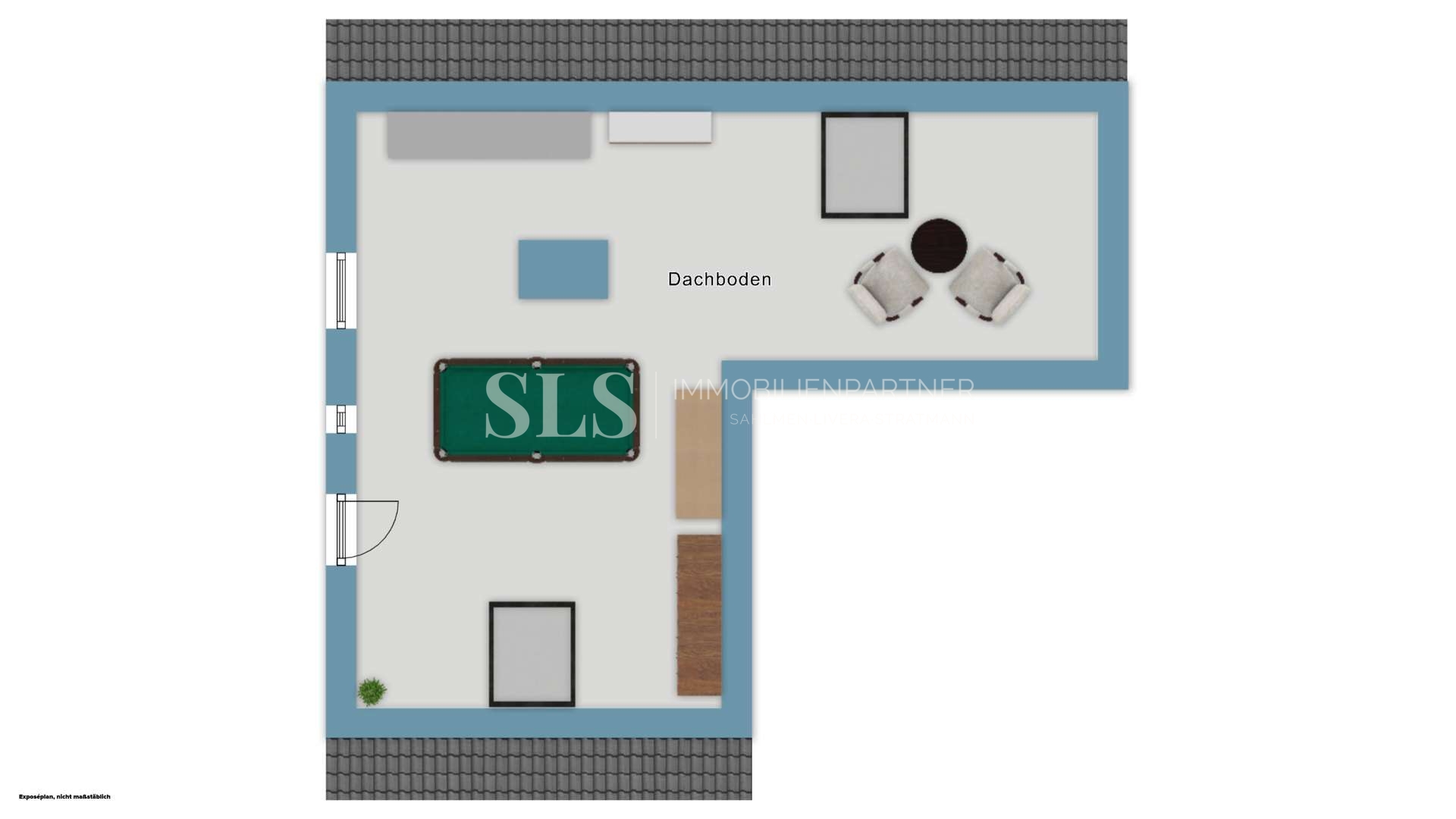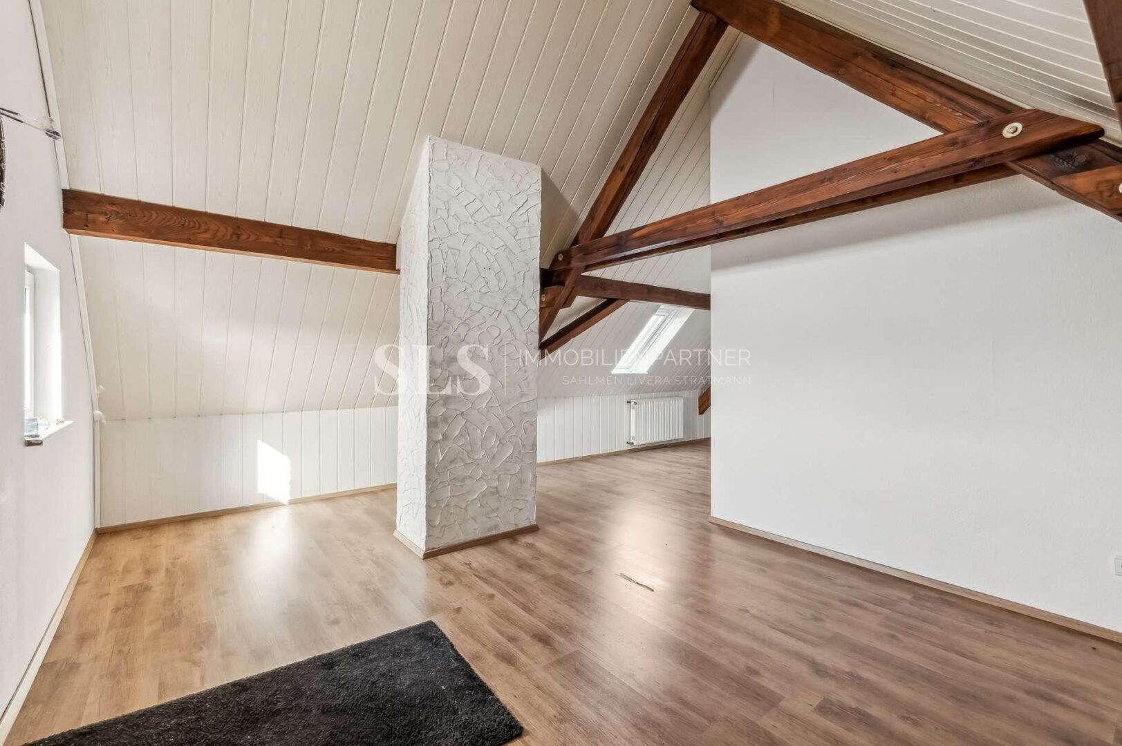 Die Wohnfläche beträgt rund 105 m² und verteilt sich auf Erdgeschoss und Obergeschoss. Darüber hinaus ist das Dachgeschoss wohnlich ausgebaut und bietet zusätzliche Nutzfläche von etwa 23 m². Der Raum ist offen gestaltet und durch sichtbare Holzbalken geprägt, wodurch ein sehr angenehmer Studiocharakter entsteht. Die Fläche ist nicht als Wohnraum genehmigt, erweitert das Haus jedoch spürbar und lässt sich vielseitig nutzen.