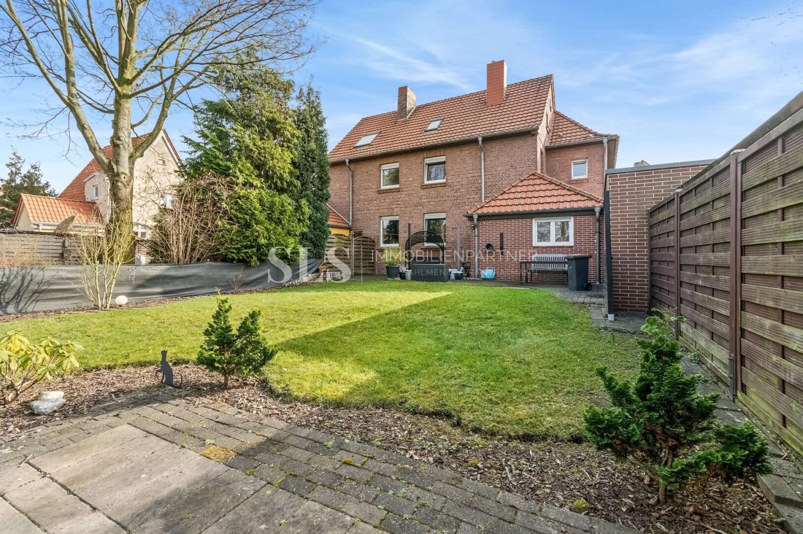 Das Grundstück umfasst etwa 342 m². Hinter dem Haus befindet sich eine große Terrasse, die direkt von der Küche aus erreichbar ist und einen angenehmen Übergang in den Garten bildet. Der Garten ist schön angelegt und bietet viel Platz für Erholung, Freizeit und individuelle Gestaltung. Durch die Größe des Grundstücks entsteht ein sehr gut nutzbarer Außenbereich, der sowohl Raum für Gartenmöbel und Grillplatz als auch für Spiel- oder Aufenthaltsflächen bietet.